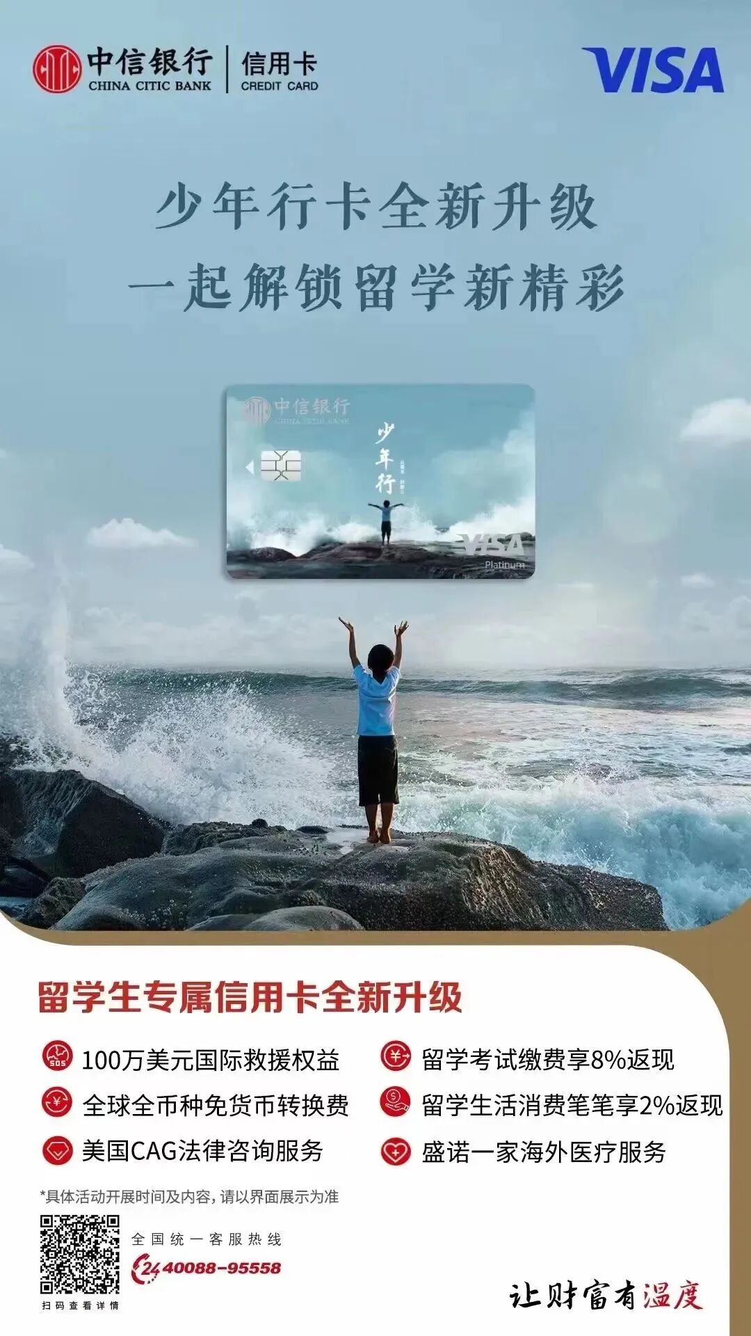 针对留学家庭,首次发行 “中信银行Visa逍遥白金信用卡——少年行版”,更为持卡客户子女提供“少年行版”附属信用卡,整合海内外优质教育、健康、法律等资源和力量,一站式解决客户及其子女金融和非金融需求。