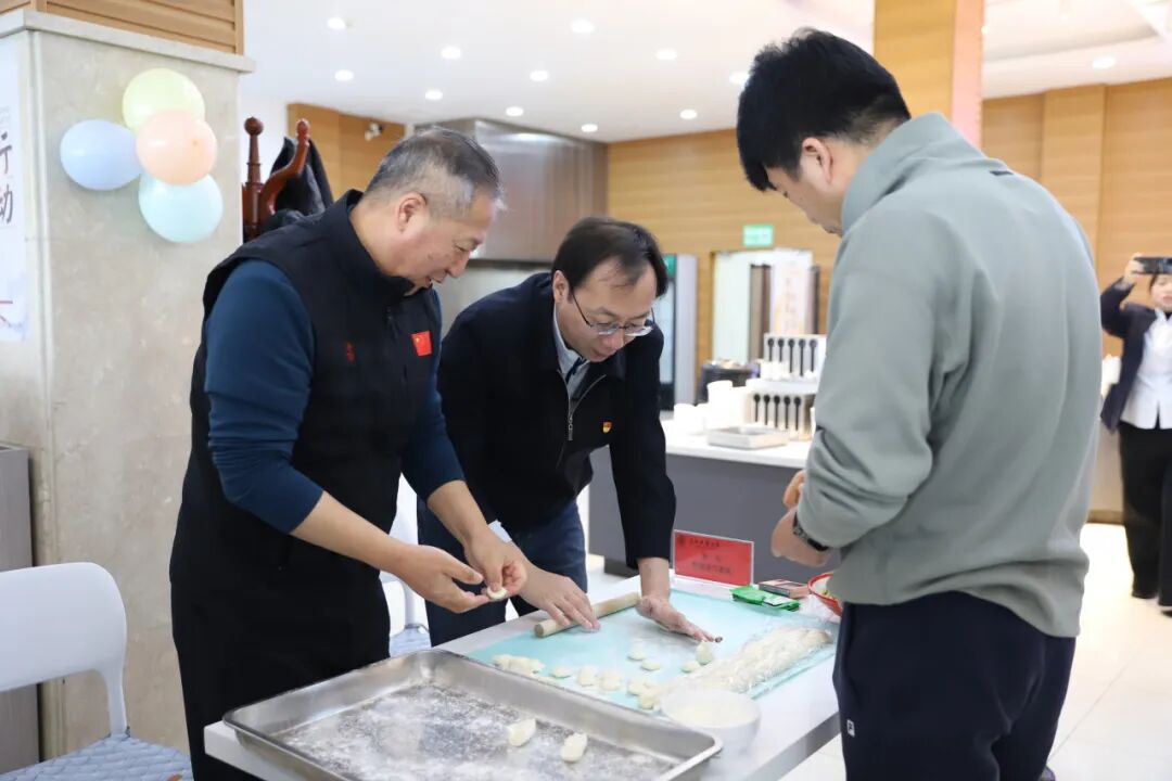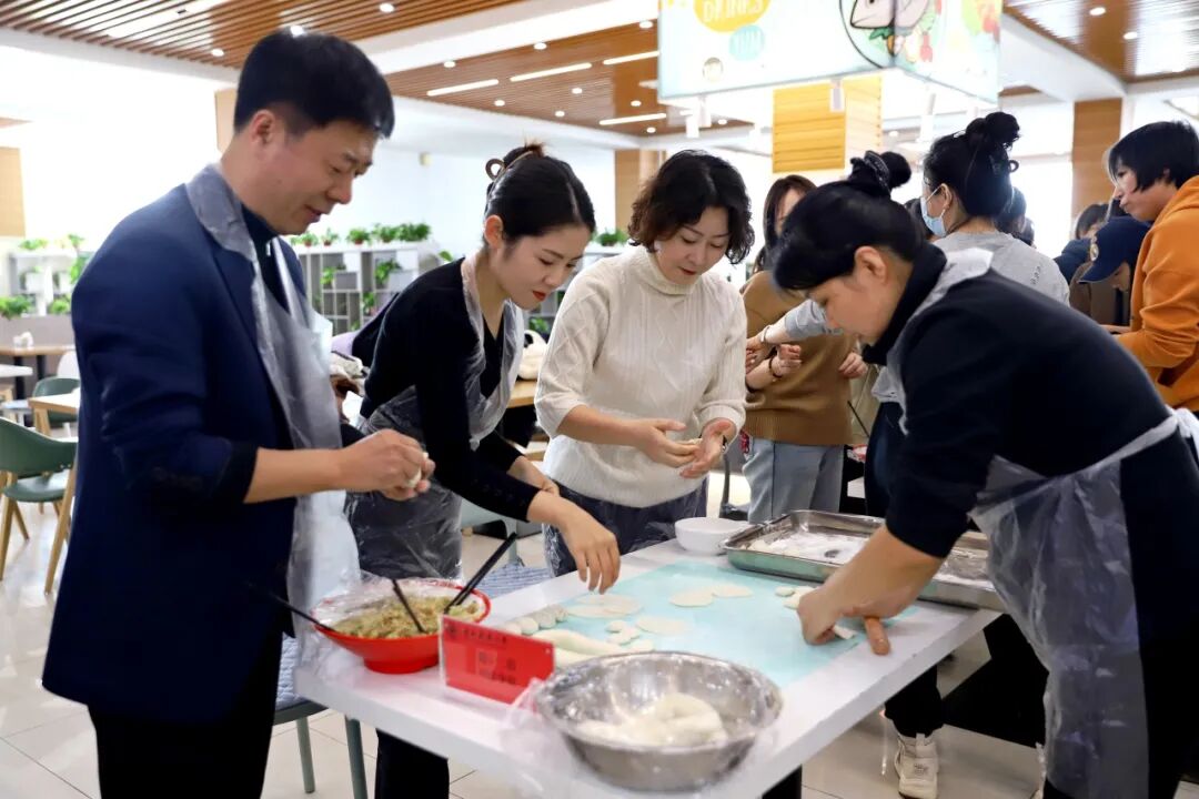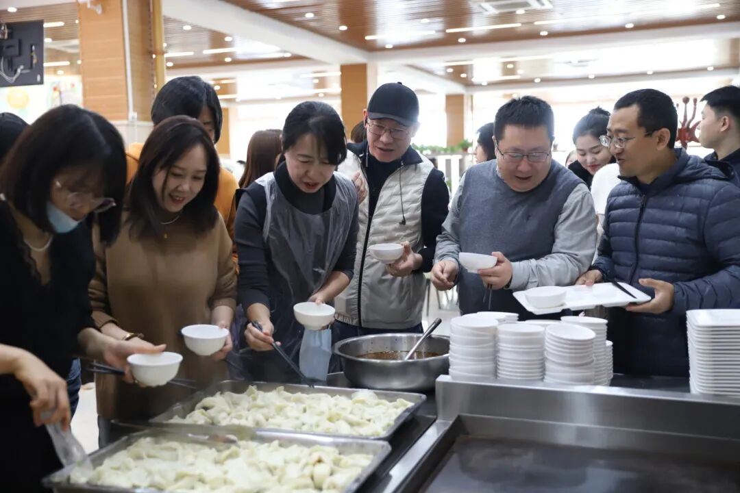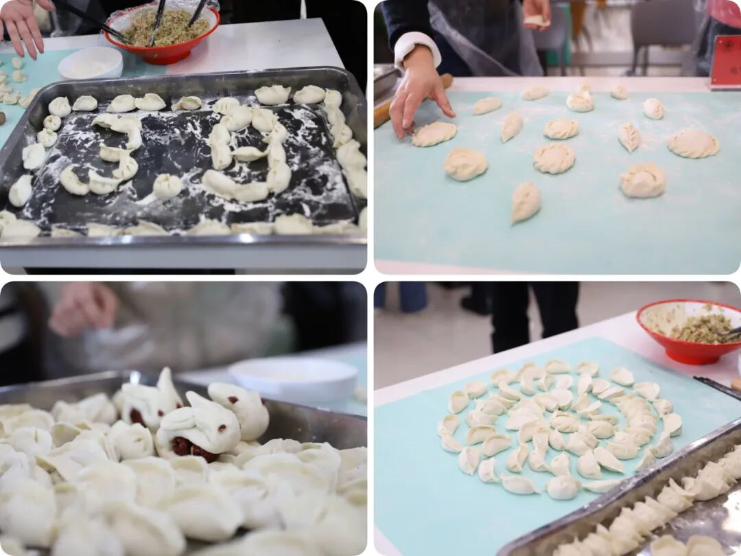 陈雷宣布活动开始,大家分工协作,揉面、揪面剂、擀皮,动作娴熟,现场气氛热闹。新鲜的饺子馅和面皮经过巧手一捏,变成了一个个精美别致饺子,被陆陆续续、整整齐齐地摆放在托盘里。计时结束后,刚出锅的饺子摆上餐桌,大家共同品尝自己的劳动成果,在热气腾腾、喜气洋洋的氛围中享受着节日的喜悦。