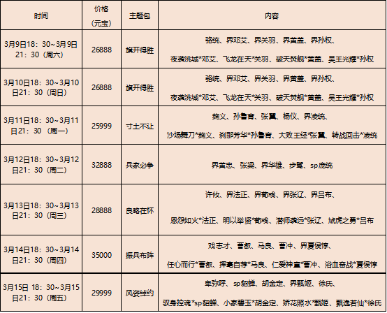 特惠中心368元宝出售武将礼包(魏)*1+武将礼包(蜀)*1+武将礼包(吴)*1+武将礼包(群)*1,每人每日限购5次