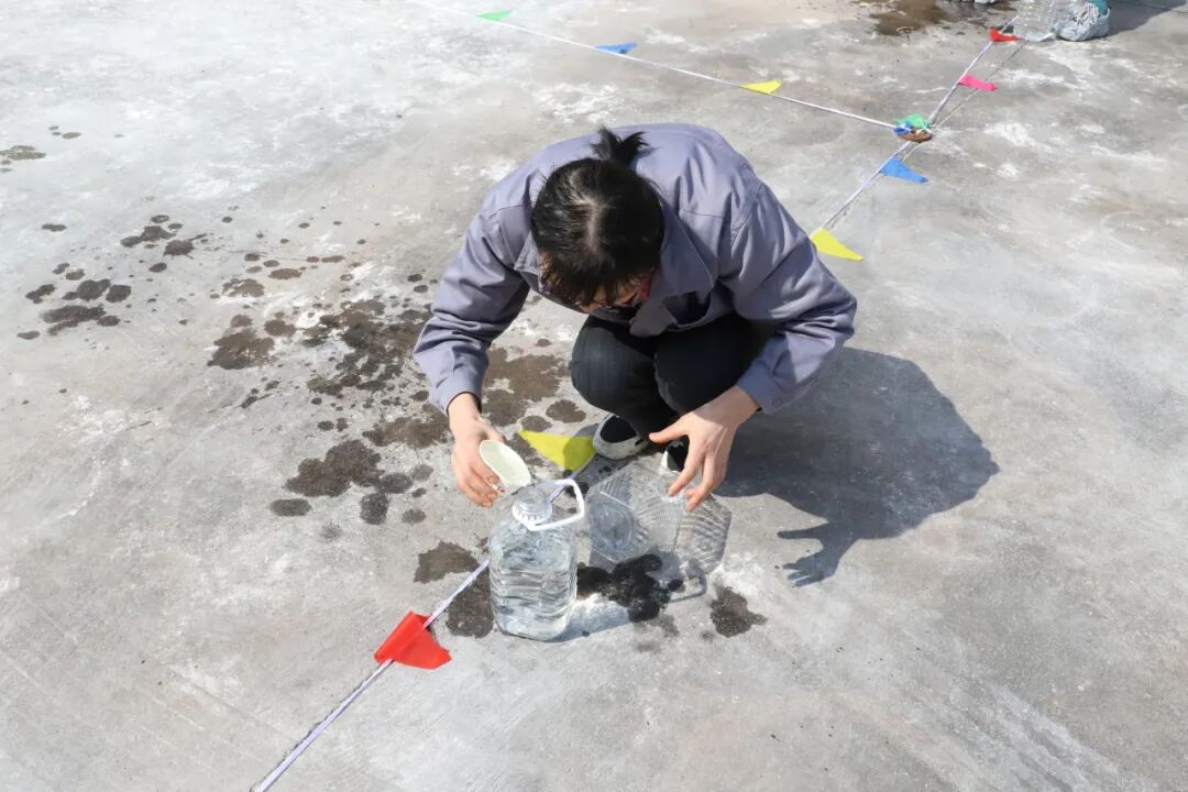 本次趣味运动比赛项目是羽毛球拍运水。参赛选手分成四组,在规定的时间内,每组参赛选手需将装满水的杯子用羽毛球拍运送至指定位置并返回起点,下一位选手继续运送,依次进行。选手们团结一心,众志成城,现场观众也兴致昂扬,助威声不绝于耳,整个场面气氛热烈非凡。