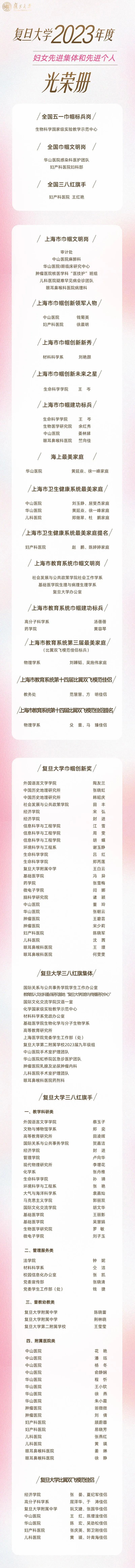 今天(3月8日)上午,复旦大学纪念“三八”国际妇女节114周年暨先进表彰大会举行。会上揭晓了复旦大学2023年度全国、上海市、上海市教育系统、上海市卫生健康系统、复旦大学妇女先进个人、集体名单。副校长汪源源,校党委常委、上海医学院党委副书记、副院长徐军,校党委常委、宣传部部长、教师工作部部长陈玉刚出席大会并为获奖代表颁奖。