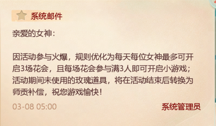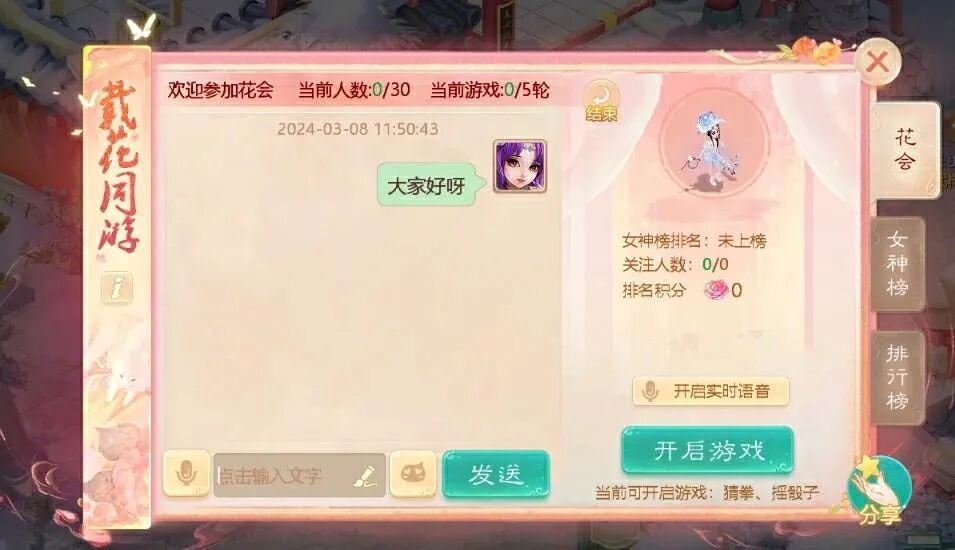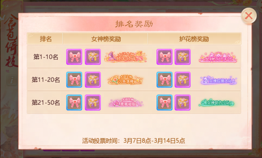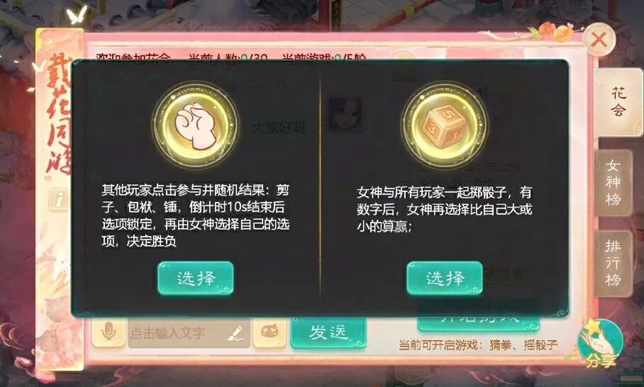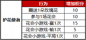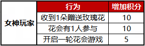 女神玩家:通过非女神玩家送花、以及参与花会玩家人数获得积分;
