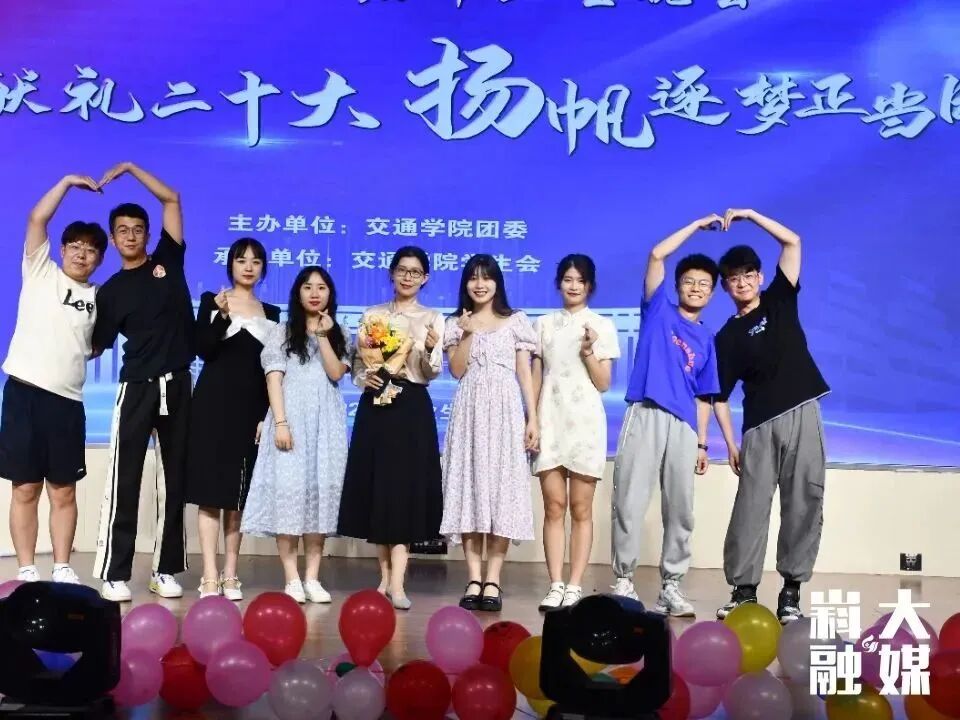 辅导员刘倩婧毕业生晚会现场和学生们合影