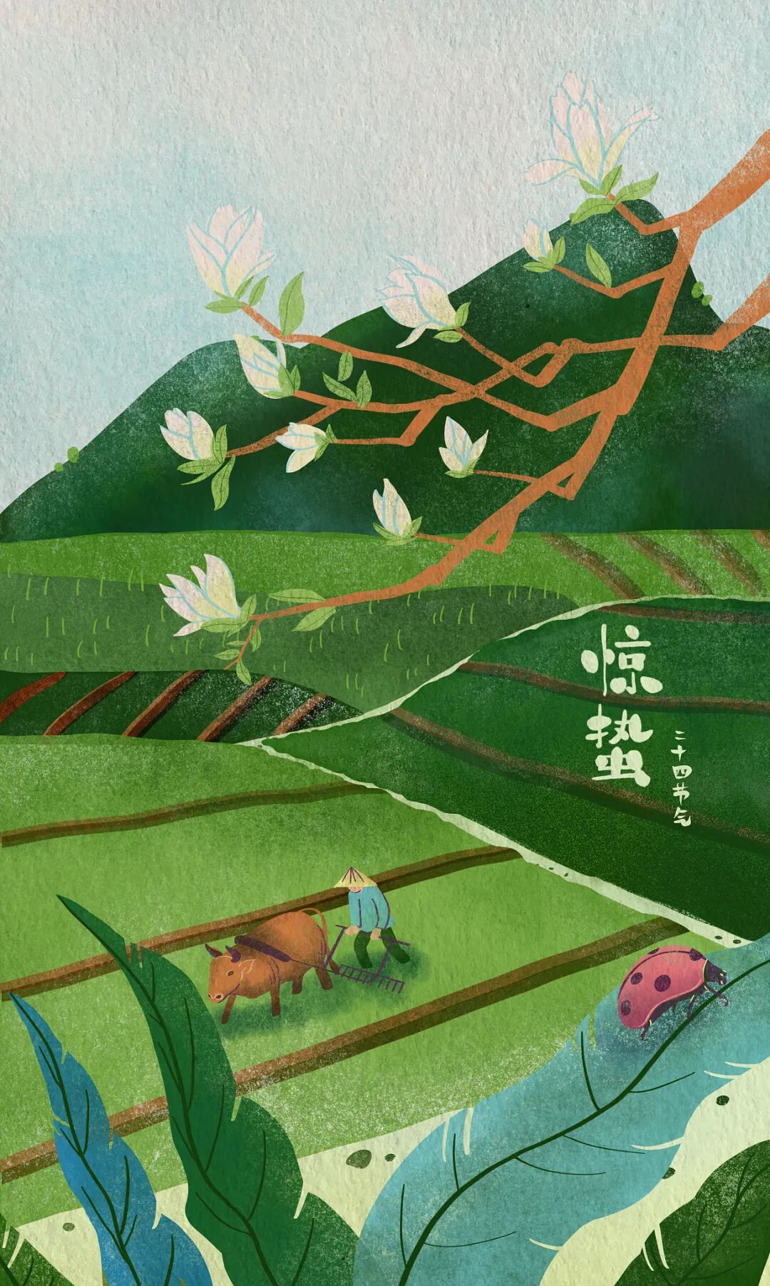 一个“惊”字,把这个时节的独有特点与生动景象,极其传神地表达了出来。春雷响起,蛰虫惊醒,天气转暖,大部分地区进入春耕季节,农家告别了农闲时期,开始紧张地忙碌起来。唐代诗人韦应物的《观田家》写得好:“微雨众卉新,一雷惊蛰始。田家几日闲,耕种从此起。”只有惊蛰时节开始耕种,才有一年的好收成啊!