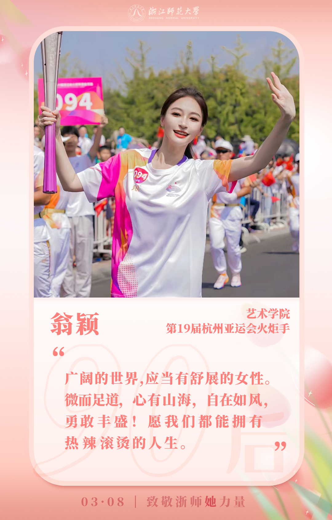 作为又红又正、一专多能的校园“红”人代表,翁颖担任了杭州亚运会火炬传递金华站第94棒火炬手。她连续参加团中央云团课、浙江省高校网络思政《新辅导员上手100问》等节目录制,网络点击量累计破4000万,积极参与省内各类理论宣讲、大中小学校思政课巡讲100余场。通过探索“理论宣讲+网络思政”模式,“润物细有声”地传播后浪潮音,广受欢迎。