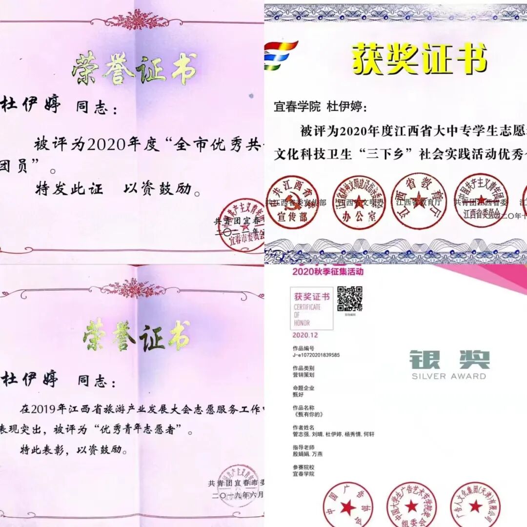 2020年,在江西省大中专学生志愿者暑期三下乡社会实践活动中获优秀个人称号,中国大学生广告艺术节学院奖获策划案类银奖;