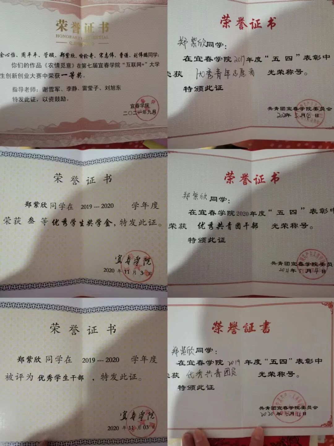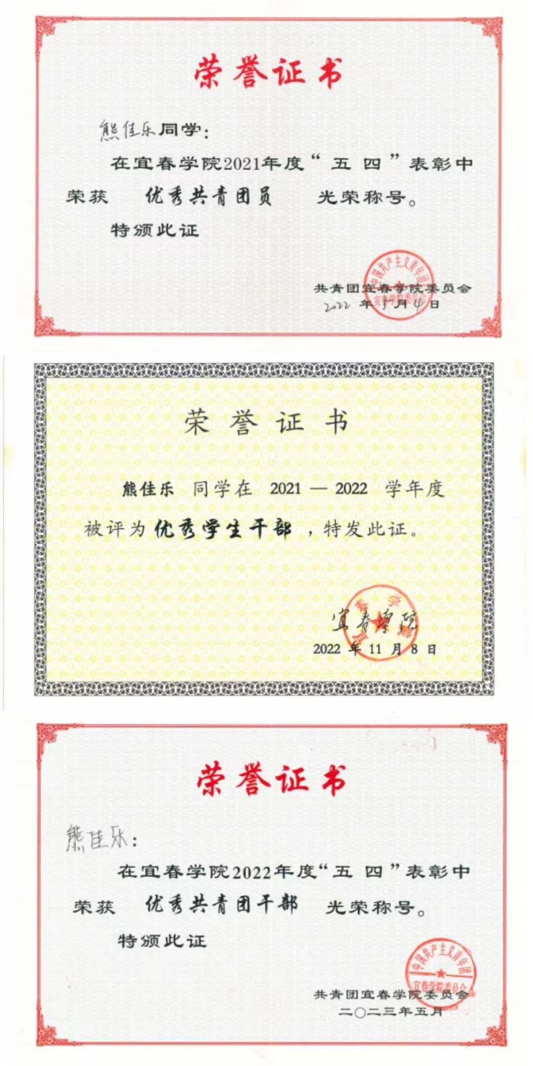 此外,曾获宜春学院优秀学生叁等奖学金,被评为优秀学生干部、优秀共青团干部、优秀共青团员。
