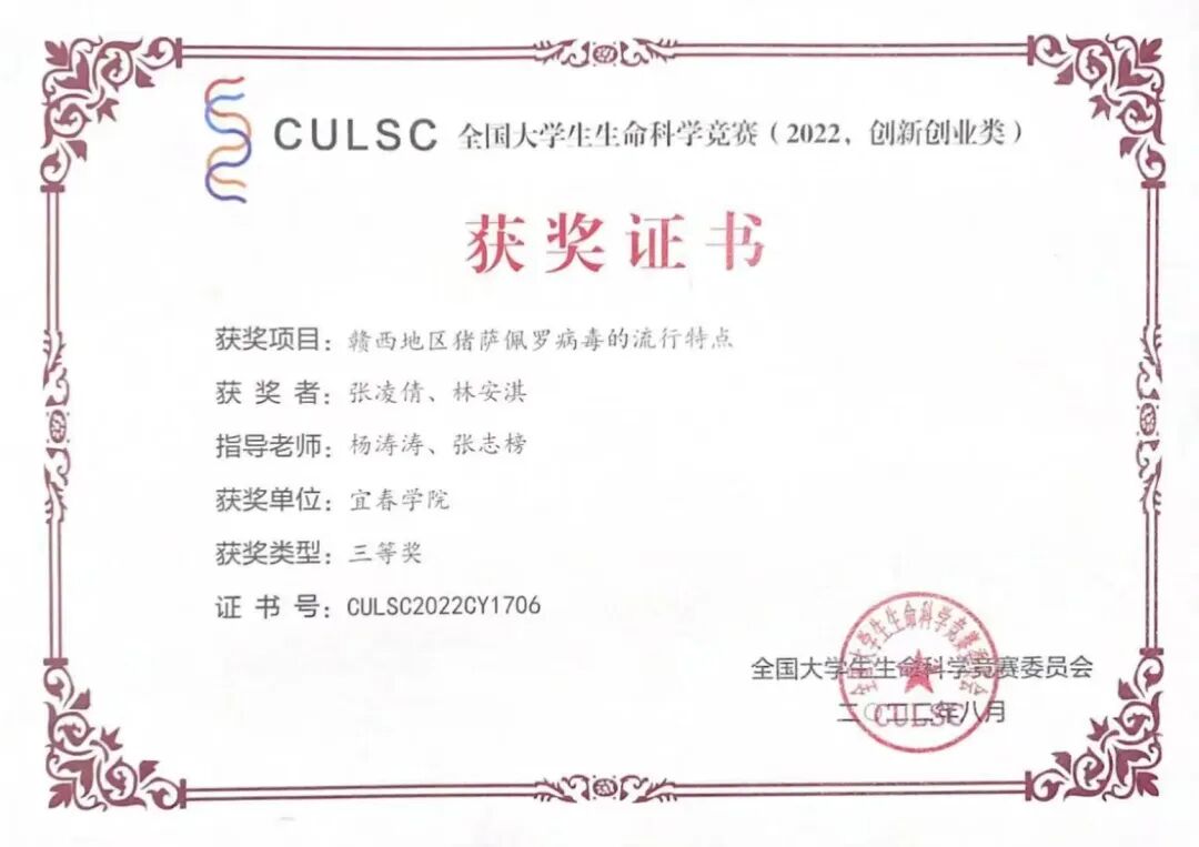 2022年,曾获全国大学生生命科学竞赛三等奖、第八届全国大学生生命科学竞赛(科学探究类)江西赛区二等奖、第十八届“挑战杯”全国大学生课外学术科技作品江西赛区三等奖、第八届“雄鹰杯”小动物医师技能大赛二等奖。