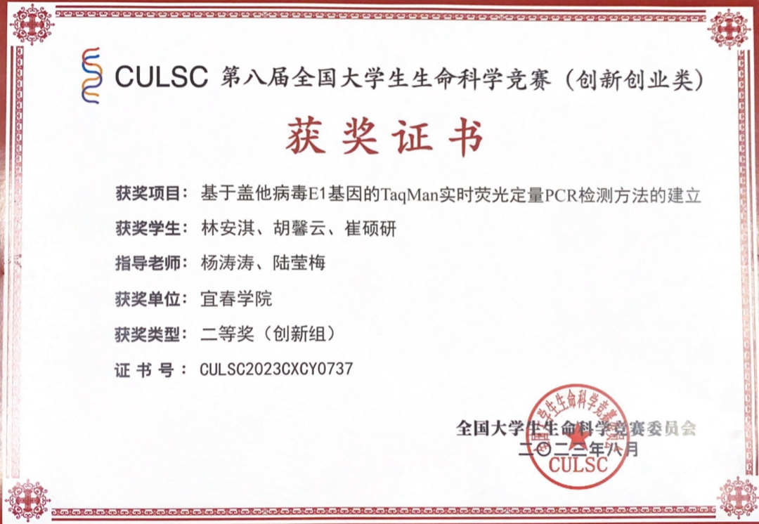 2021年7月她参与“盖他病毒SYBR Green Ⅰ实时荧光定量RT-PCR方法的建立”项目,参与发表SCI级别“Characterization of porcine sapelovirus prevalent in western Jiangxi, China ”一文,在老师和实验室学长学姐的带领下她迈进了科研项目的道路。 在经过两年的学习和沉淀她在2023年3月以第一作者发表SCI级别“Development of TaqMan-based real-time PCR assay based on the E1 gene for the quantitative detection of the Getah virus”一文,同时带领着学弟学妹参加第十八届挑战杯并获得江西省三等奖。