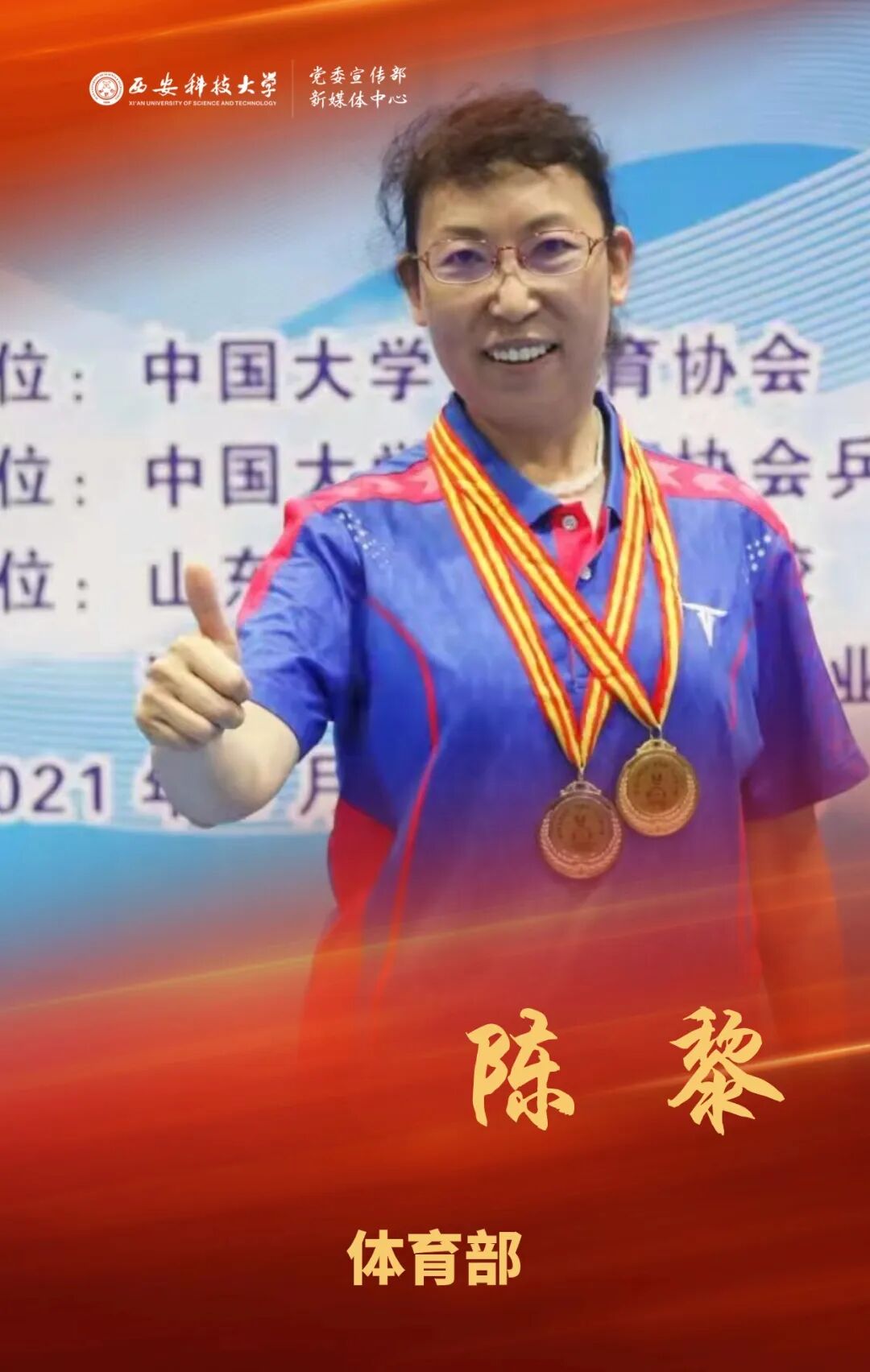 陈黎,中共党员,教授,乒乓球国际级裁判员,体育部专任教师,校乒乓球运动代表队教练,陕西省高校学生体协乒乓球专业委员会副秘书长,陕西省高校体育教学指导委员会委员,多次担任全国大型乒乓球比赛裁判。2016年,2019年带领我校大学生乒乓球队参加第七届和第十届全国大学生阳光体育乒乓球比赛均获得混合团体一等奖。多次带领校队参加陕西省高校大学生乒乓球比赛获得男单、混双、女双冠军以及女团、男双亚军,男团第五名等优异成绩,连续5年被评为陕西省高校优秀教练员。2019年,2021年代表学校参加全国高校“教授杯”乒乓球比赛,蝉联两届50-59岁年龄组女单冠军。