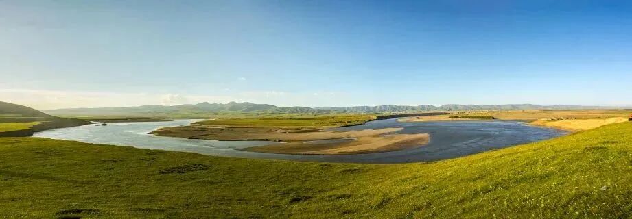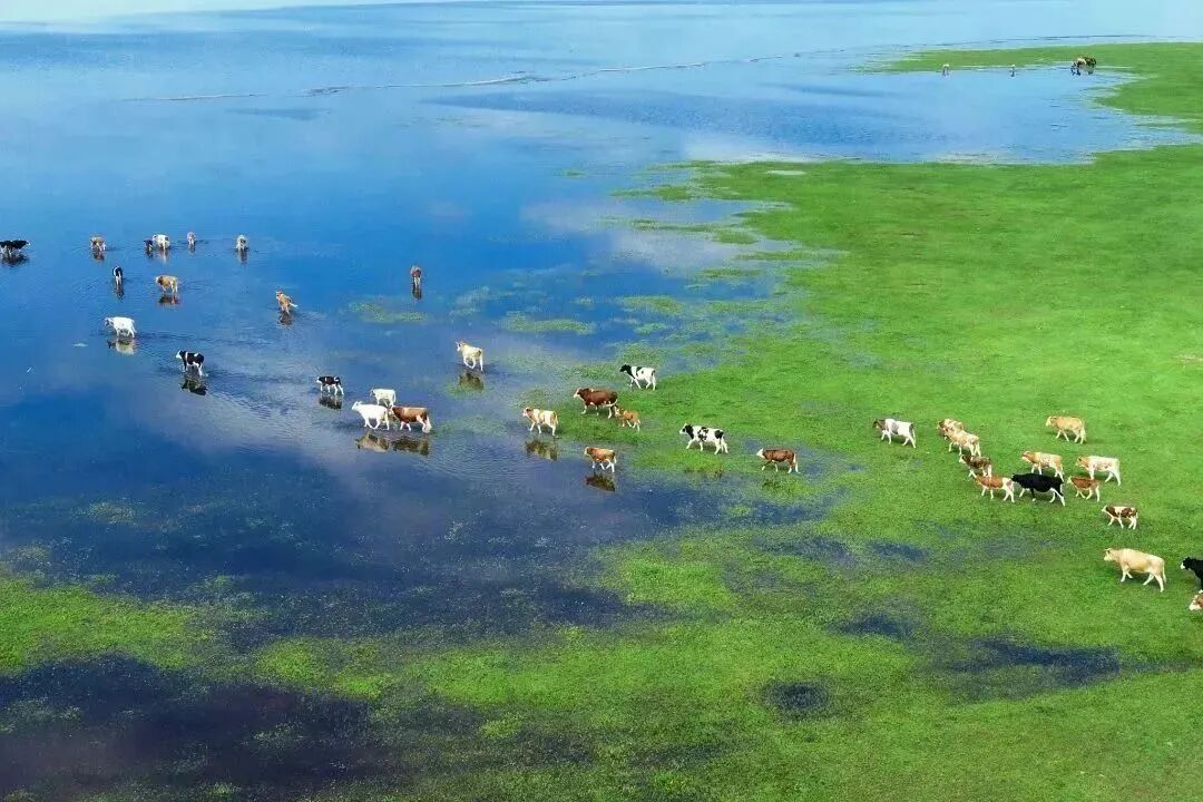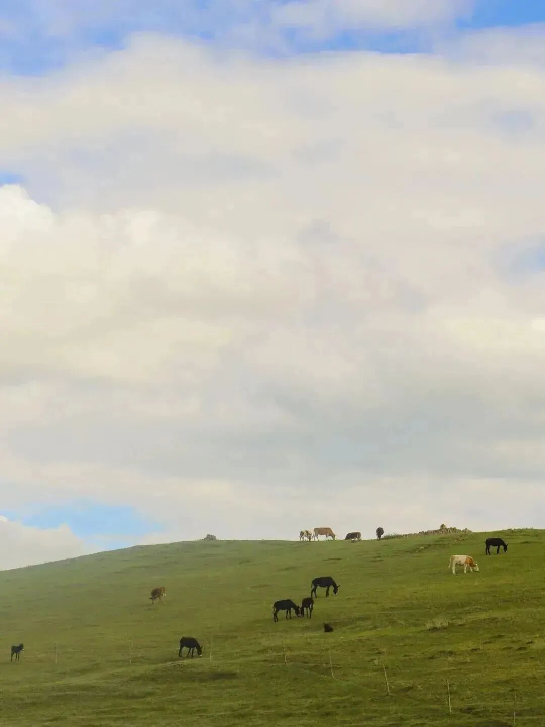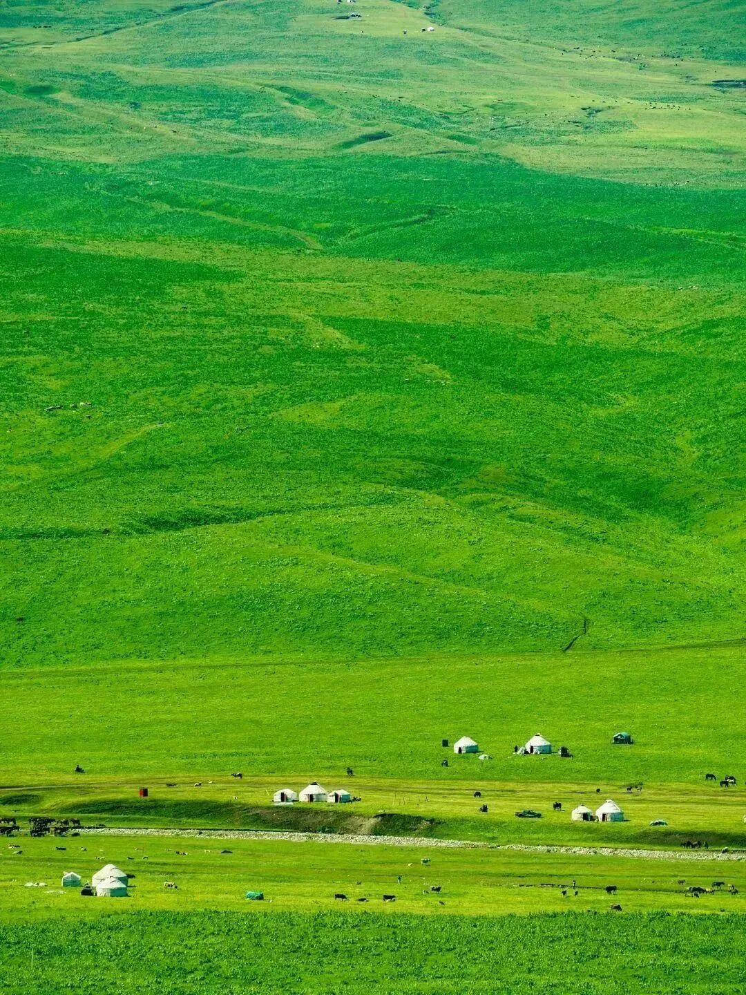 碧空如洗,绿草如茵,湖泊星罗棋布,成群的牛羊点缀其间,构成了一幅生动的“天苍苍,野茫茫,风吹草低见牛羊”的画卷。
