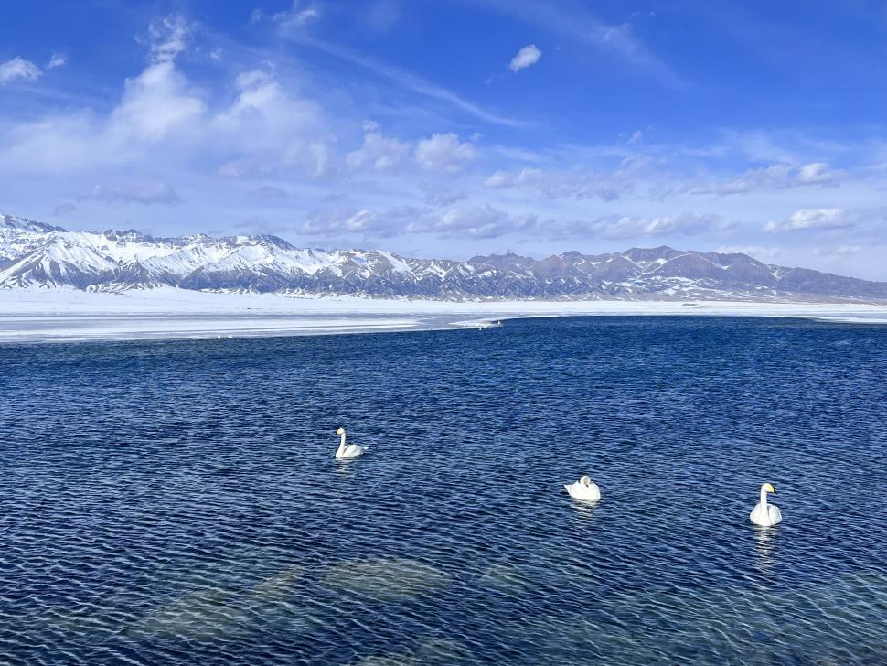 初春的赛里木湖,冰雪逐渐融化,天鹅翩然起舞,似乎在欢庆这个充满生机的季节。湖面的水波荡漾,映照着雪山的美景,如诗如画,令人神往。天鹅优雅地游动着,宛如三位舞者,在湖面上演绎着春天的故事。这片宁静的湖面,仿佛也被天鹅们的舞蹈所感染,散发出勃勃生机。春天,是万物复苏的季节,也是生命焕发的时刻。天鹅们的出现,为这片湖面增添了一抹亮色,也为我们带来了无尽的想象空间。
