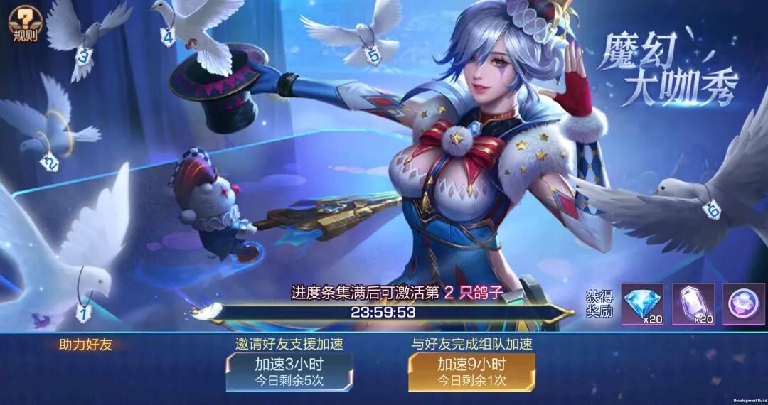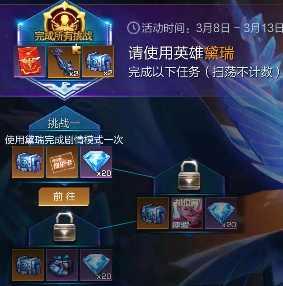 使用黛瑞完成剧情模式一次 | 抗性补给礼包*1 排位赛保护卡*1 钻石*20 |