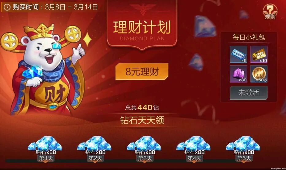 【活动详情】活动期间内,购买钻石理财,连续5天登录游戏领取丰厚钻石奖励!