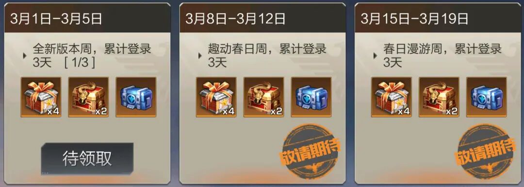 春日漫游周,累计登录3天 | 3.15-3.19 | 副本橙SS武器碎片可选礼包*4 抗性万能可选礼包*2 抗性补给宝箱*1 |