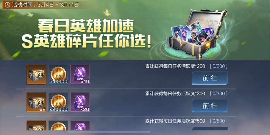 累计获得每日任务活跃度*200 | 春日英雄加速可选包*1 紫色武器精通卡*10 金币*1w |