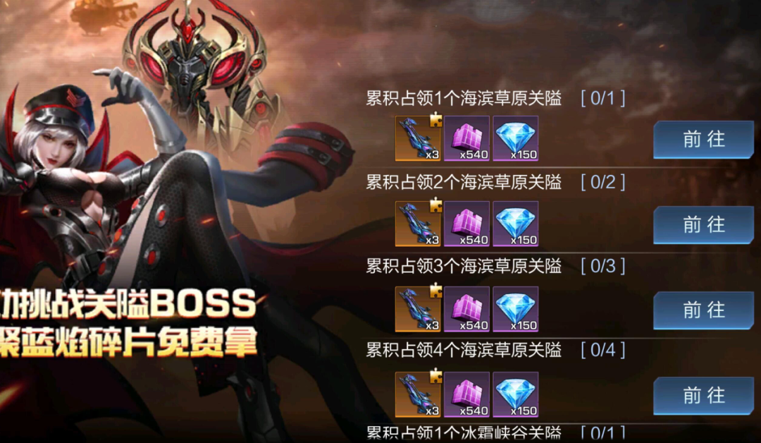累积占领3个海滨草原关隘 | 星聚蓝焰碎片*3 中级记忆合金*540 钻石*150 |