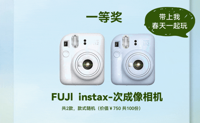 一等奖:FUJI instax一次成像相机 INSTAX mini 12,共2款,款式随机:价值750元,共100份;
