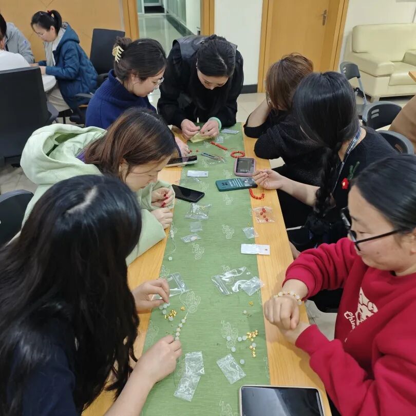 在专业手工艺老师的指导下,女性员工们围坐在工作台前,认真学习手串制作的基本技巧和注意事项。通过实践,女性员工们逐渐掌握手串制作方法。她们精心挑选玉石,巧妙搭配颜色,细心地穿线打结,每一颗玉石都被赋予了特殊的含义,每一根线都承载着她们的祝福和期望。在制作过程中,大家互相交流心得,分享技巧,现场气氛温馨而活跃。