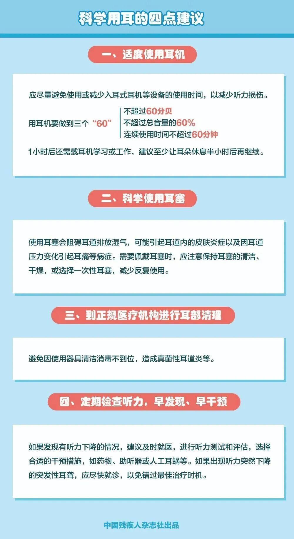 一是适度使用耳机,应尽量避免使用或减少入耳式耳机等设备的使用时间,以减少听力损伤。使用耳机要做到三个“60”(不超过60分贝、不超过总音量的60%、连续使用时间不超过60分钟),1小时后还需戴耳机学习或工作,建议至少让耳朵休息半小时后再继续。