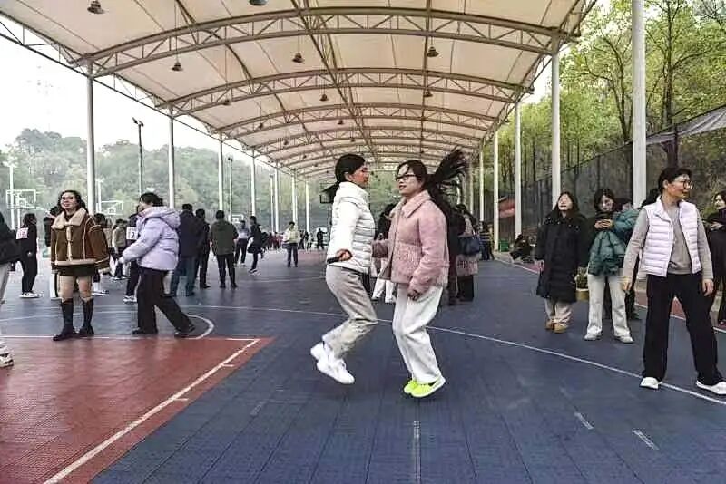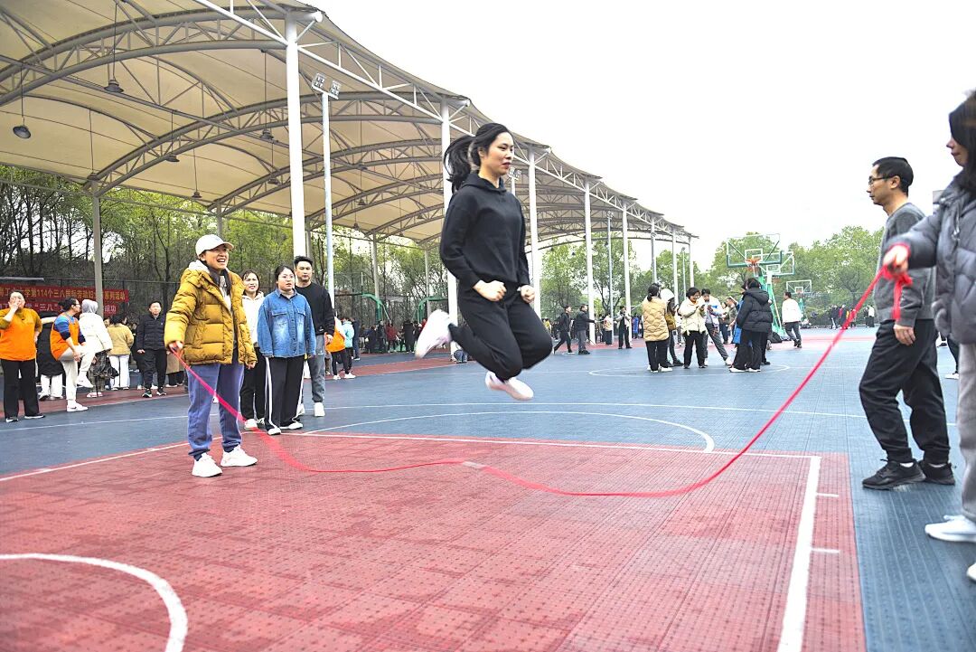 激烈而精彩的跳绳比赛在崇业楼的篮球场火热上演。