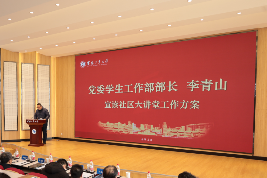 会上,学生处处长兼党委学生工作部部长李青山宣读《社区大讲堂活动实施方案》,介绍了社区大讲堂组织形式与内容,社区大讲堂将从人物访谈、专家讲授、互动提问的方式取代传统讲座模式,实现社区大讲堂周周有主题、月月有精品,将思想政治教育送入学生社区,送至学生身边。