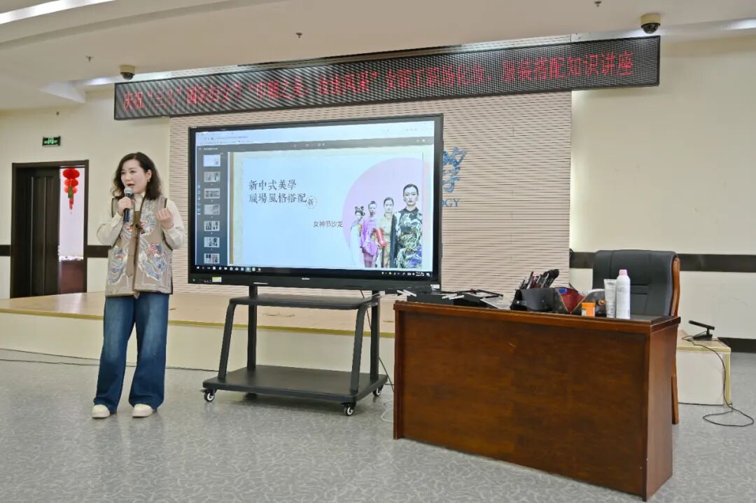 3月8日,学校举办“巾帼之美、妆出风采”职场化妆、服装搭配知识讲座,邀请演艺明星化妆合作人依琳女士和春晚服装设计人闻雅茜女士主讲。讲座以专家分享、化妆演示、时尚秀、互动游戏等精彩环节,为女职工们带来一场关于美丽与自信的精彩盛宴,引导女职工们提升自身魅力,让大家在轻松愉快的氛围中欢度节日。