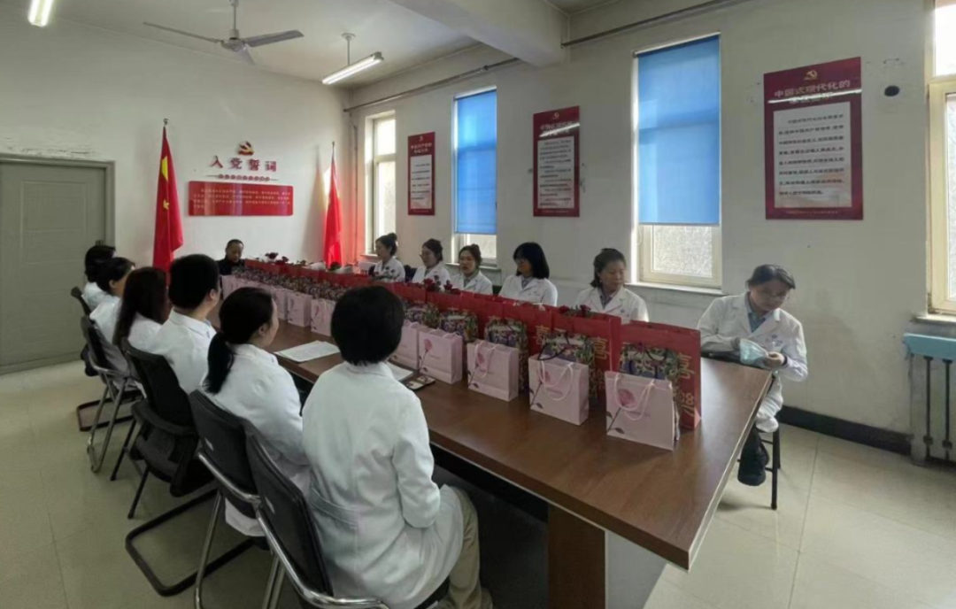 校医院举办女职工座谈会,准备了鲜花及精美糕点。