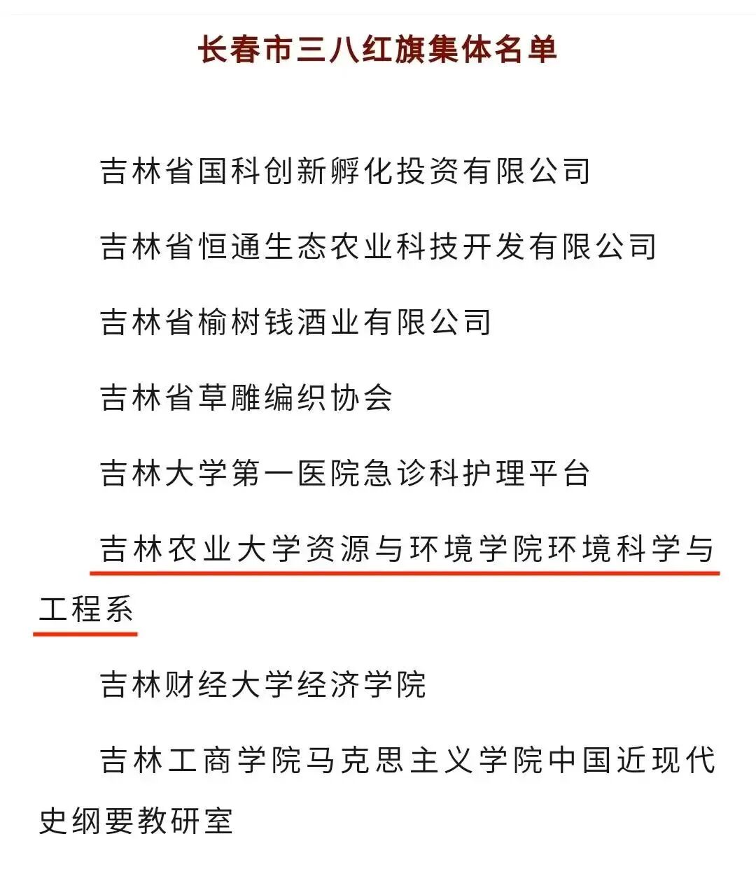 3月7日,在第114个“三八”国际妇女节来临之际,中共长春市委 长春市人民政府对长春市三八红旗手和长春市三八红旗集体进行表彰,由我校推荐的动物科学技术学院副教授王秋举、由长春市女性花艺协会推荐的人文学院(家政学院)副教授孙冬梅荣获长春市“三八红旗手”荣誉称号,资源与环境学院环境科学与工程系荣获长春市三八红旗集体荣誉称号。