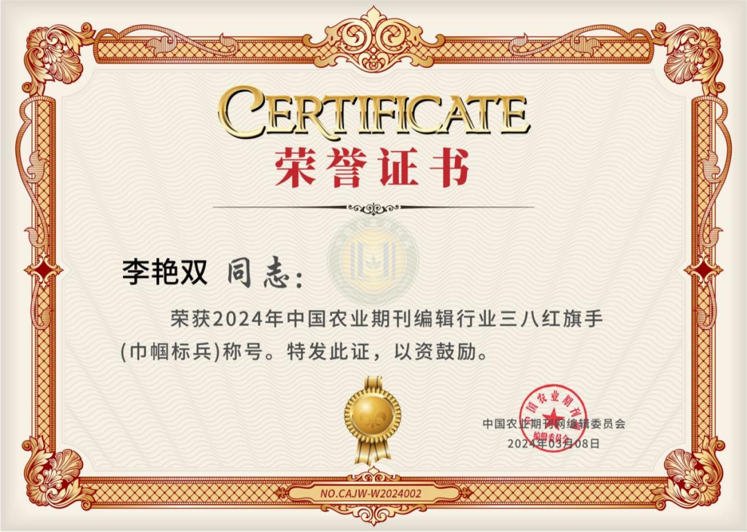 我校期刊中心李艳双荣获2024年中国农业期刊编辑行业“三八”红旗手(巾帼标兵)称号
