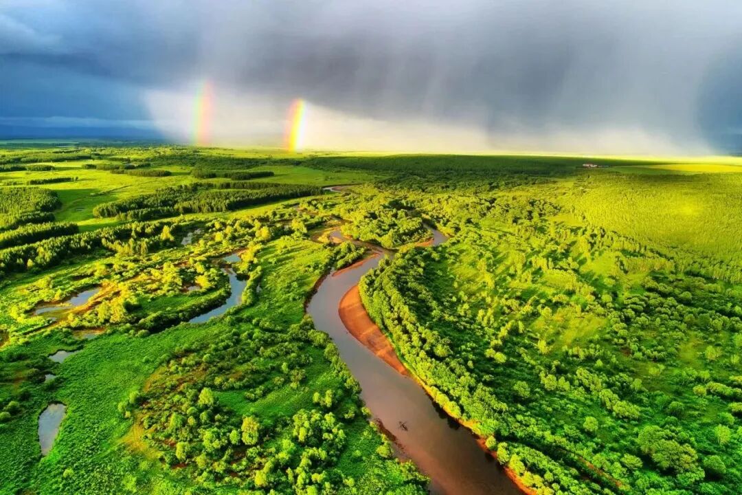 大兴安岭森林地理风光,雨后河湾彩虹景观(航拍)