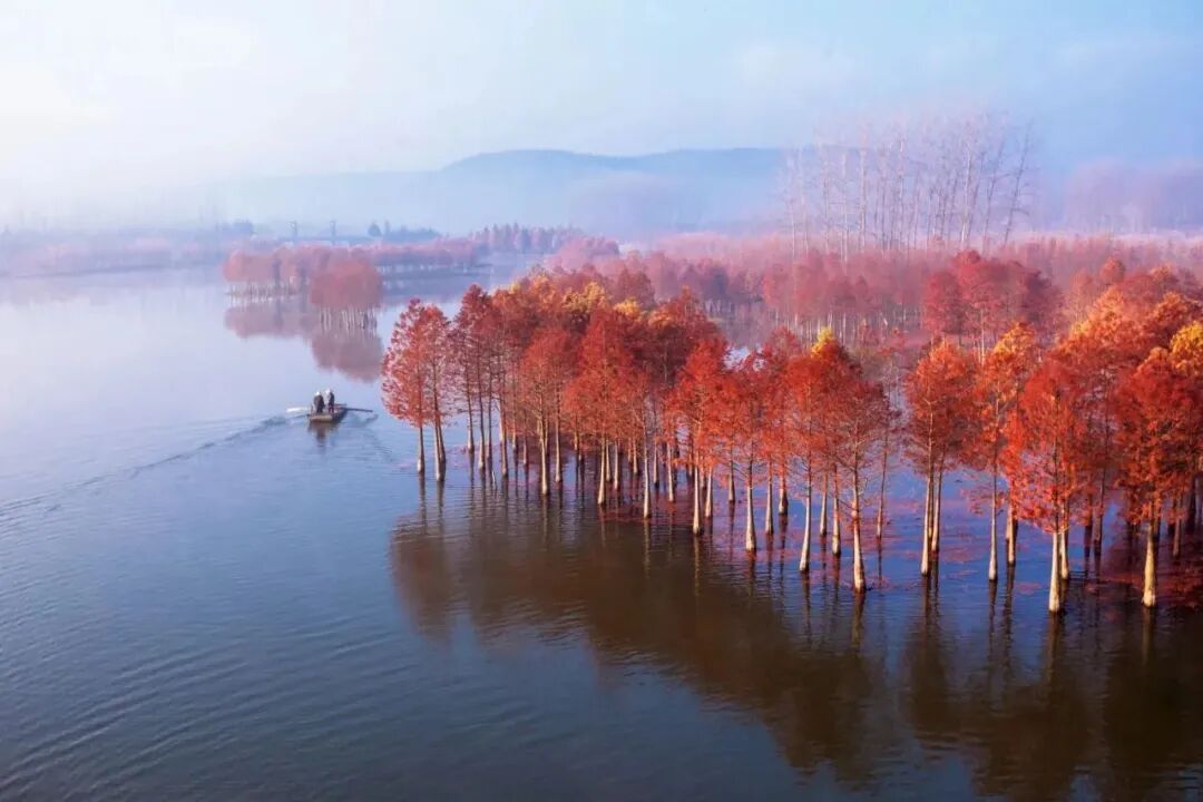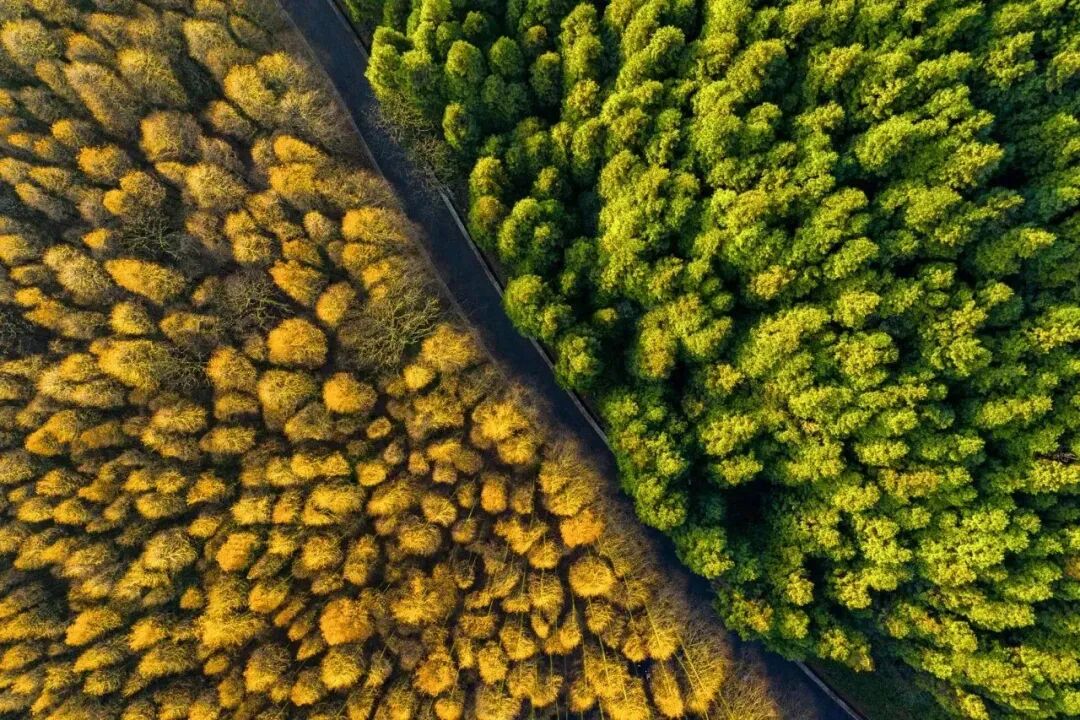 重庆南川区喀斯特国家生态公园,重庆森林公园泾渭分明,一半春色一半秋超震撼。初冬时节,从空中鸟瞰,金黄色的水杉,意味着丰收的喜庆,而翠绿色的柳杉,则充满着希望的绿意