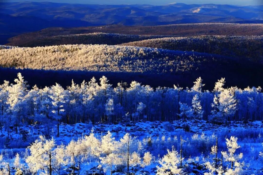 大兴安岭原始森林地理冰雪风光,雪色山岭,林海雪原树林雾凇树挂,雪域雪林雪景