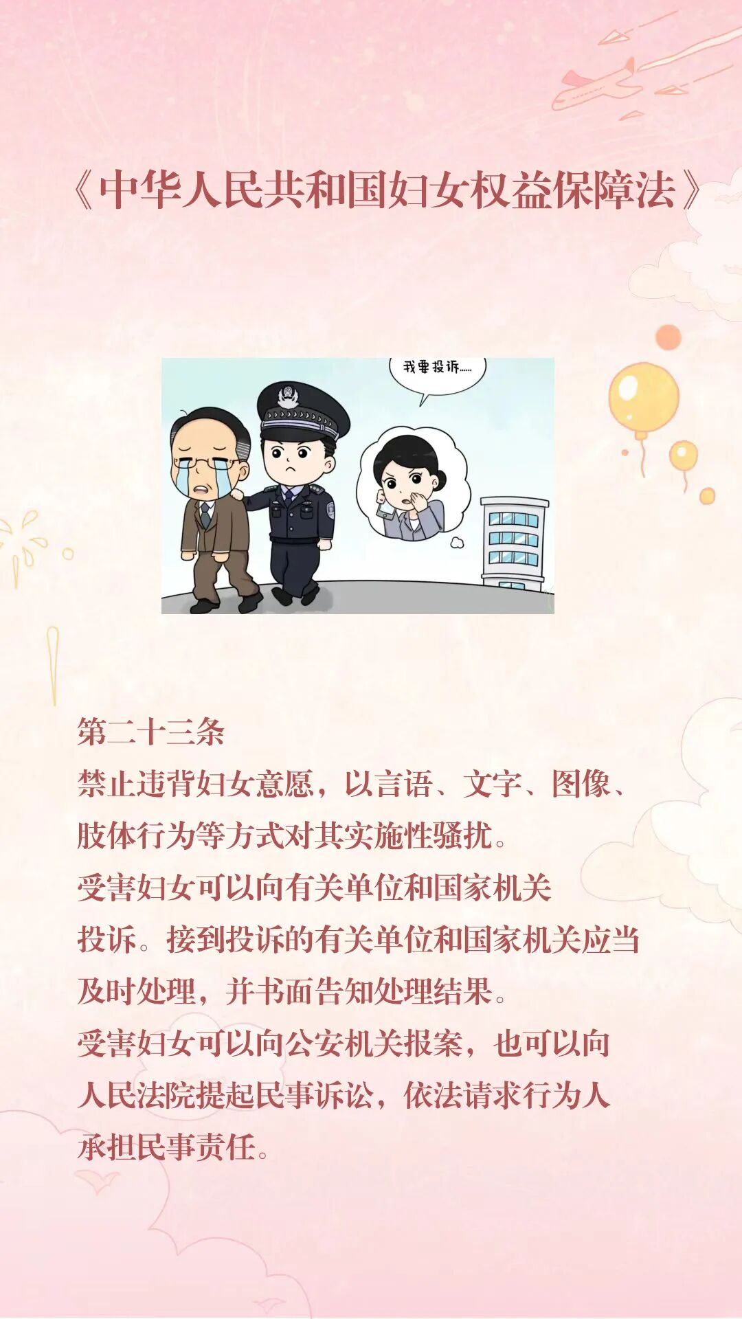 第二十三条 禁止违背妇女意愿,以言语、文字、图像、肢体行为等方式对其实施性骚扰。