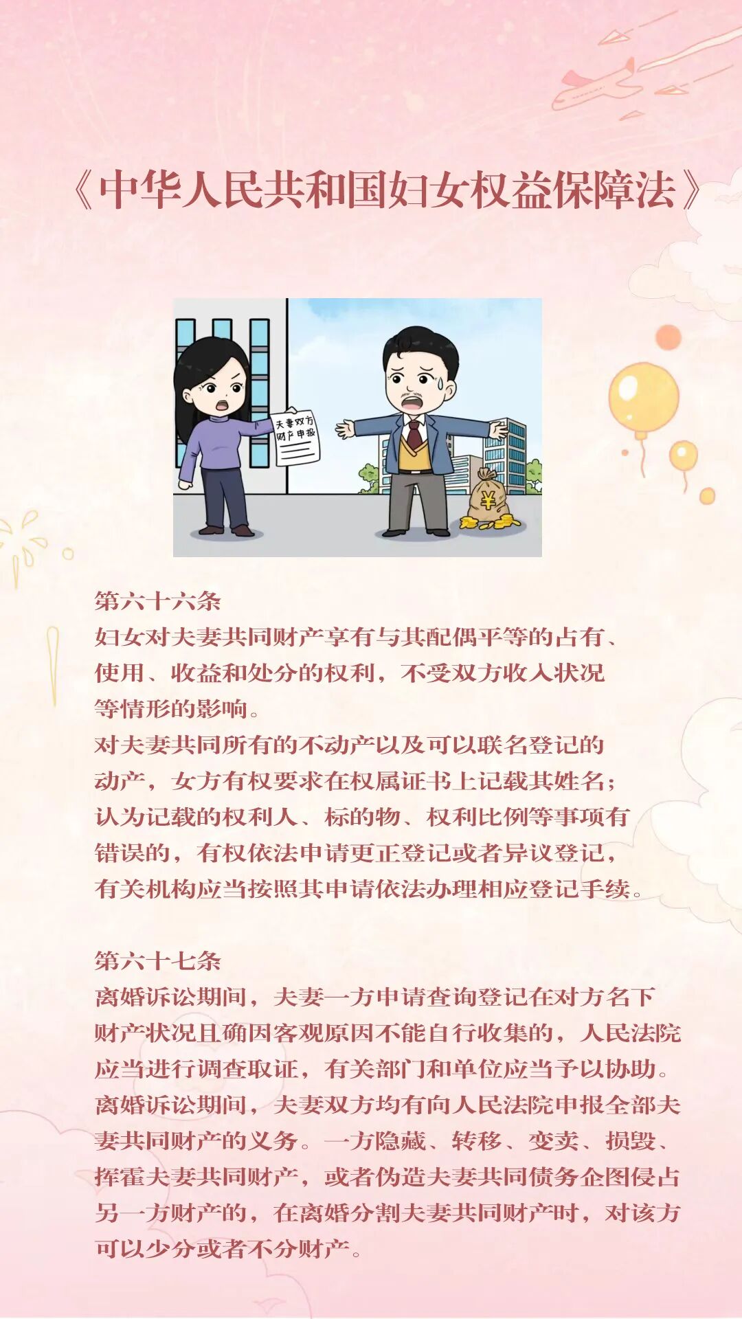第六十六条 妇女对夫妻共同财产享有与其配偶平等的占有、使用、收益和处分的权利,不受双方收入状况等情形的影响。
