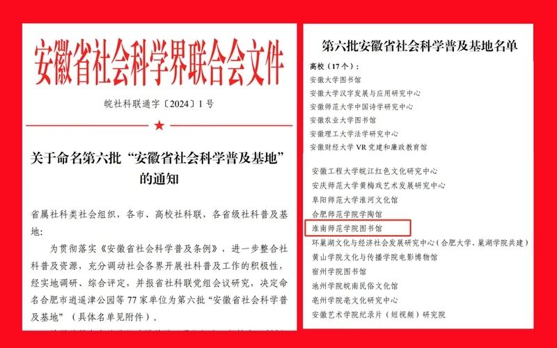 近日,安徽省社会科学界联合会发布《关于命名第六批“安徽省社会科学普及基地”的通知》(皖社科联通字[2024]1号),淮南师范学院图书馆成功入选第六批安徽省社会科学普及基地名单。