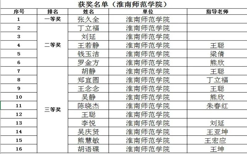 (2)优秀组织单位奖:淮南师范学院、合肥工业大学、安徽师范大学、阜阳师范大学、安徽三联学院获得由大赛主办单位颁发的“优秀组织单位奖”奖牌,共计5个单位;