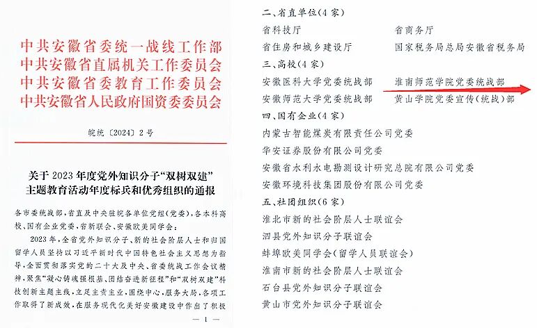 近日,省委统战部、省直机关工委、省委教育工委、省国资委联合发文,对全省2023年度党外知识分子“双树双建”(树牢理想信念、树好社会形象,建功立业争创一流业绩、建言献策服务发展大局)主题教育活动中取得突出成绩的个人和组织予以通报表彰。淮南师范学院党委统战部荣获2023年度党外知识分子“双树双建”主题教育活动“优秀组织”奖,全省仅四所高校获此殊荣。