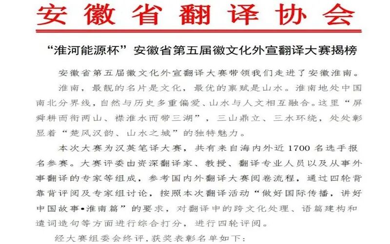 近日,“淮河能源杯”安徽省第五届徽文化外宣翻译大赛揭榜,淮南师范学院师生闪耀舞台,斩获佳绩,荣获一等奖1名、二等奖5名、三等奖10人,共计16人,约占获奖总数的三分之一。