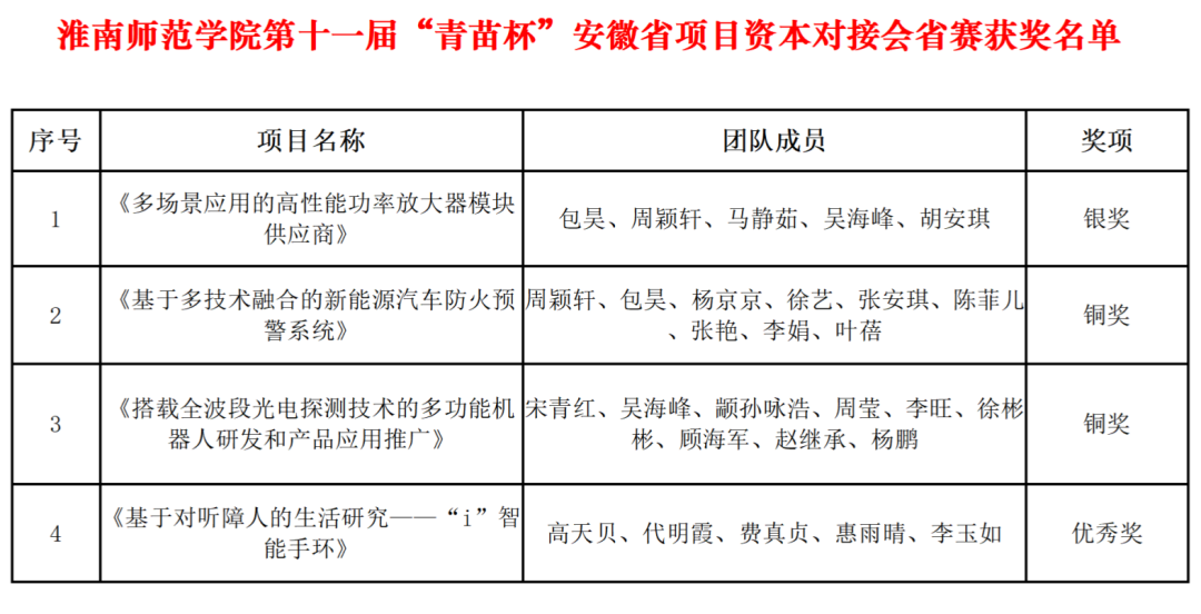 3月7日至8日,“兴泰赋能 智赢未来”第十一届“青苗杯”安徽省项目资本对接会在合肥举办,淮南师范学院喜获佳绩,荣获银奖1项、铜奖2项、优秀奖1项,取得历史新突破。