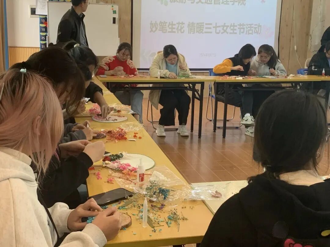 为庆祝3月7日女生节,关爱女生,展现高校女生风采。2024年3月7日下午14:30~16:00,旅游学院在东区第3教学楼205教室开展女生节手工DIY活动。