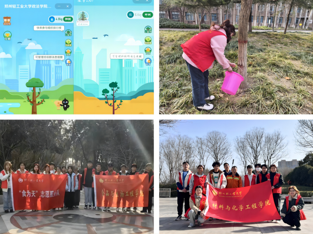政法学院充分利用线上平台,组织学生开展“指尖上的绿色行动”线上植树活动,通过节能减排、绿色出行等方式参与网络植树,将低碳环保理念融入学生日常生活。材料与化学工程学院、食品与生物工程学院、软件学院、环保协会等组织学生志愿者分别在须水河、紫荆山公园等地开展绿色环保志愿服务活动,通过捡拾垃圾、清扫落叶、浇灌树木、劝阻不文明行为等方式,为社会环境治理贡献青春力量。青年志愿者协会开展“为校园增添一抹绿”志愿服务活动,志愿者们拿着水桶、扫把、垃圾篓,为校内树木浇水、清除杂草和垃圾,用实际行动践行绿色梦想,助力美丽校园建设。