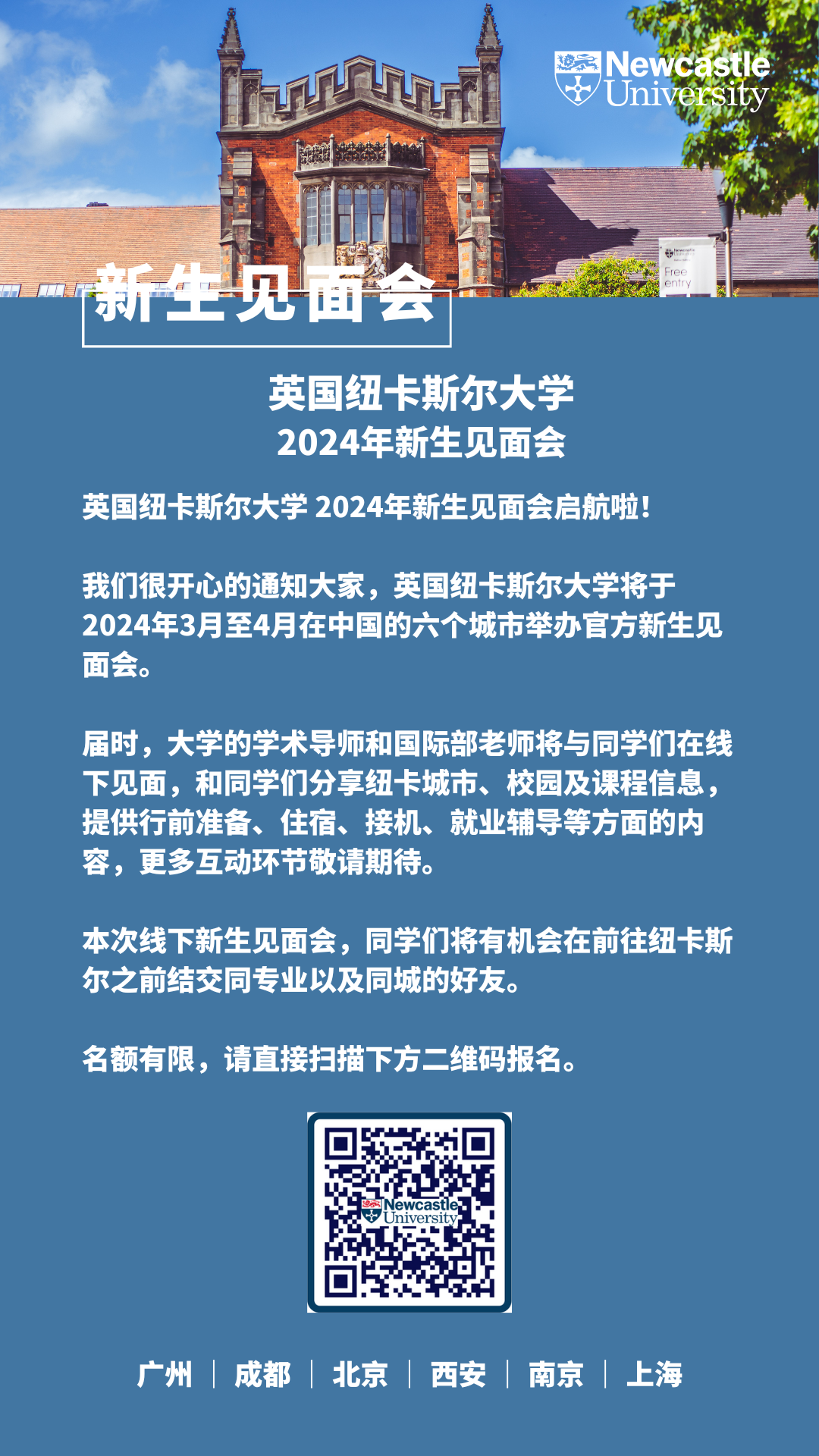 我们很开心的通知大家,英国纽卡斯尔大学将于2024年3月至4月在中国的六个城市举办官方新生见面会。届时大学的学术导师和国际部老师将与同学们在线下见面,和同学们分享纽卡城市、校园及课程信息,提供行前准备、住宿、接机、就业辅导等方面的内容,更多互动环节敬请期待。