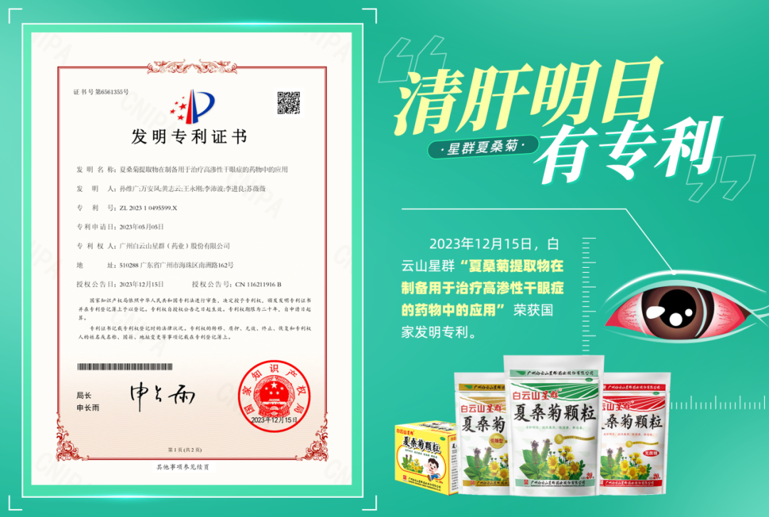 如今,该项研究终于取得阶段性成果,2023年12月15日,星群夏桑菊荣获“夏桑菊提取物在制备用于治疗高渗性干眼症的药物中的应用”(专利号:ZL202310495599.X)国家发明专利。