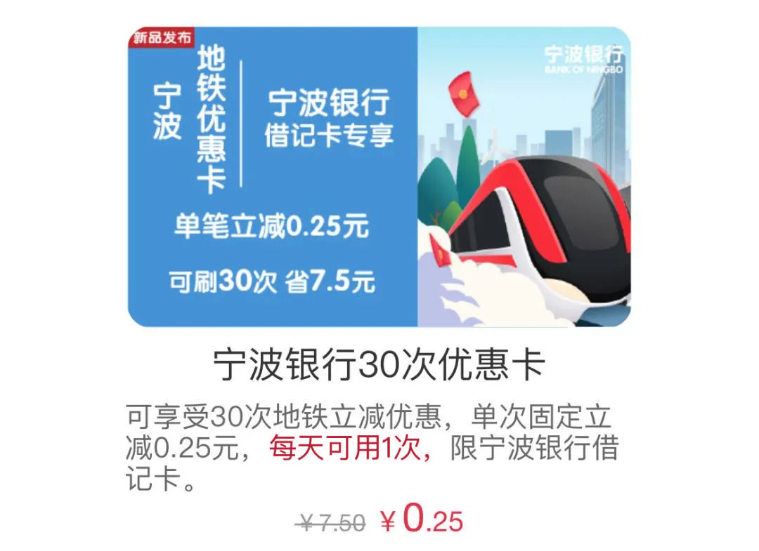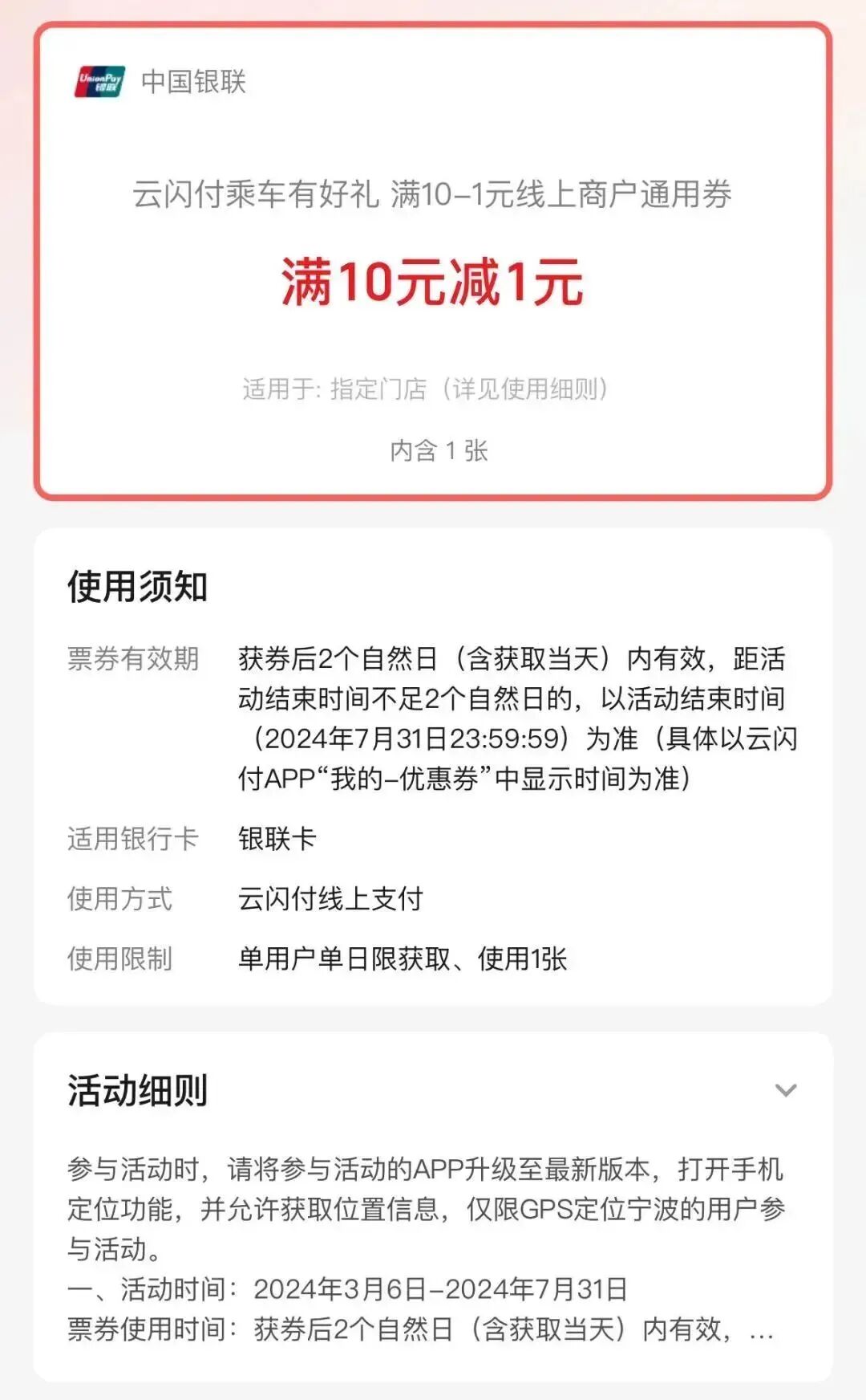 2024年3月6日至7月31日期间,宁波地区用户(须打开GPS定位)使用云闪付乘车码乘坐宁波公交、地铁有机会获得1张满10元减1元线上支付通用券,单用户单日限获1张券。上述券可在京东、拼多多、美团、饿了么、国家电网等受理银联线上支付产品的APP中使用,有效期为2天(含获券日),单用户每日限核销1张券。