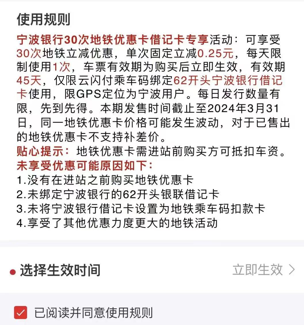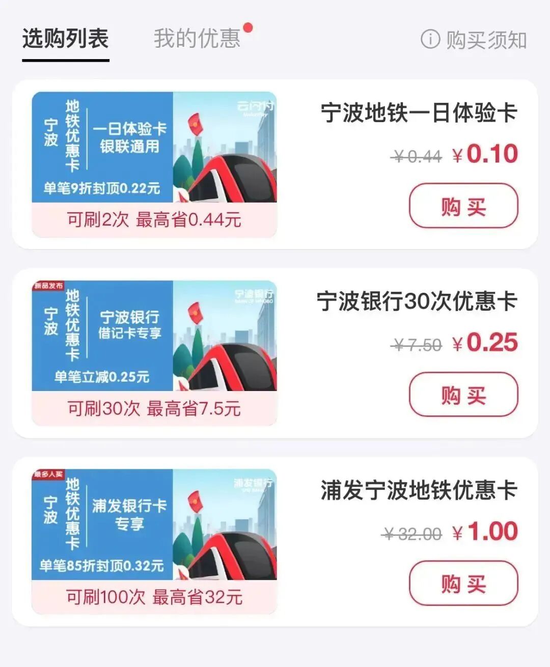 截至2024年3月31日,在云闪付APP首页【出行】-【地铁】地铁优惠卡的购卡页面可选择上述多种优惠卡购买,同一地铁优惠卡价格可能发生波动,对于已售出的地铁优惠卡不支持补差价。活动细则详见云闪付APP活动页,请仔细阅读【购买须知】。