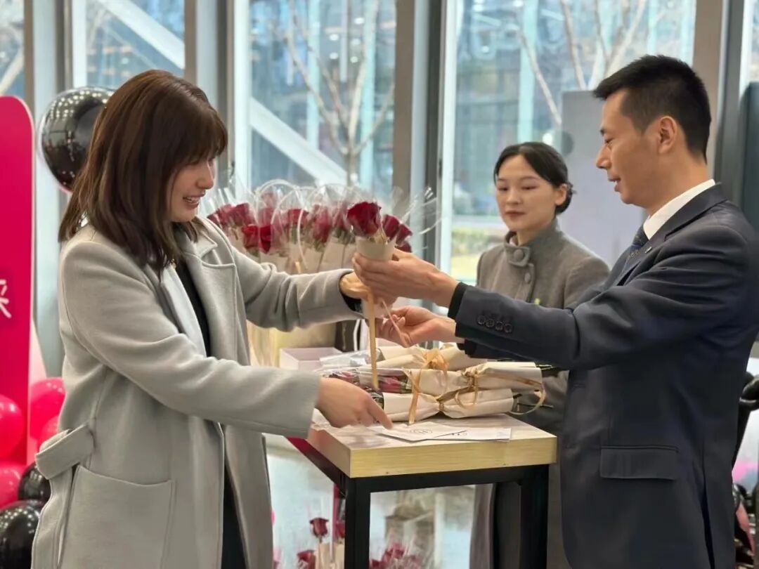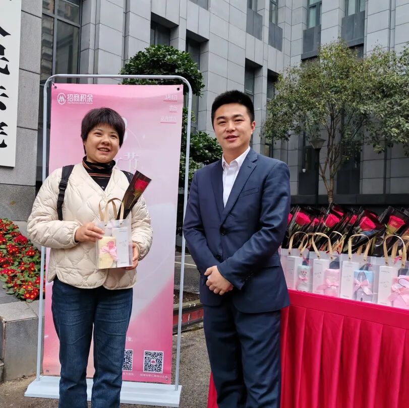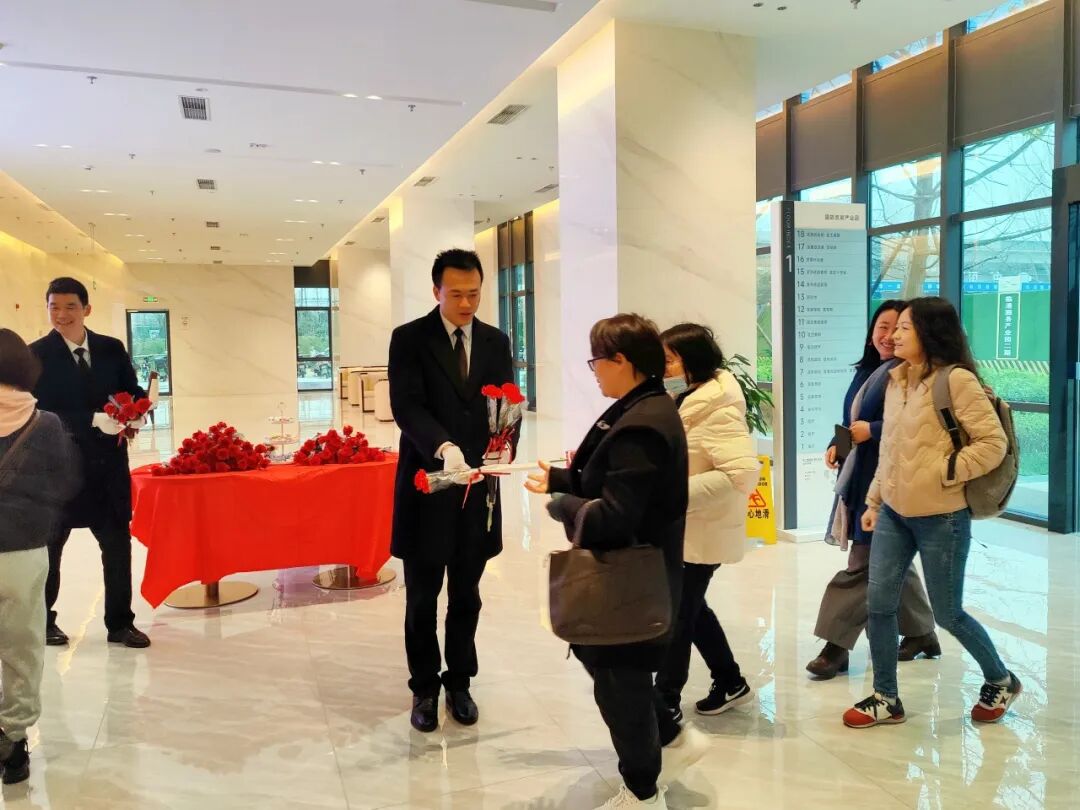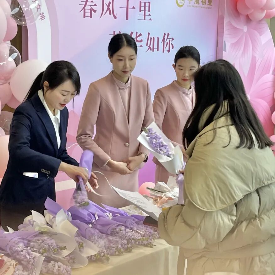 积余物业人穿梭在楼宇间、守候在小区的出入口,化身为“鲜花使者”给女性业主献上鲜花、礼品和节日的第一声祝福。