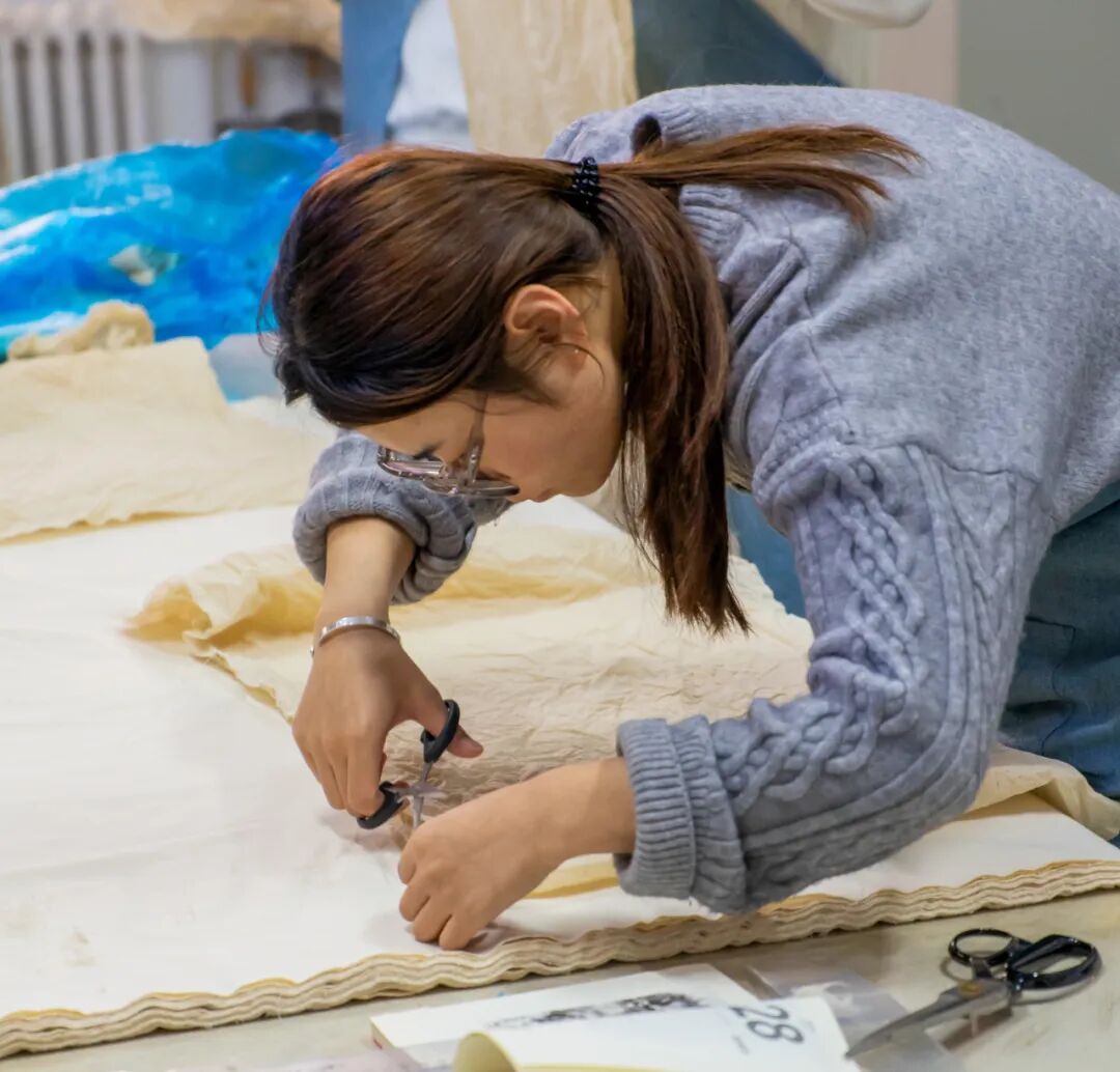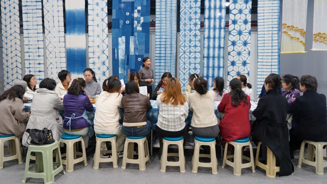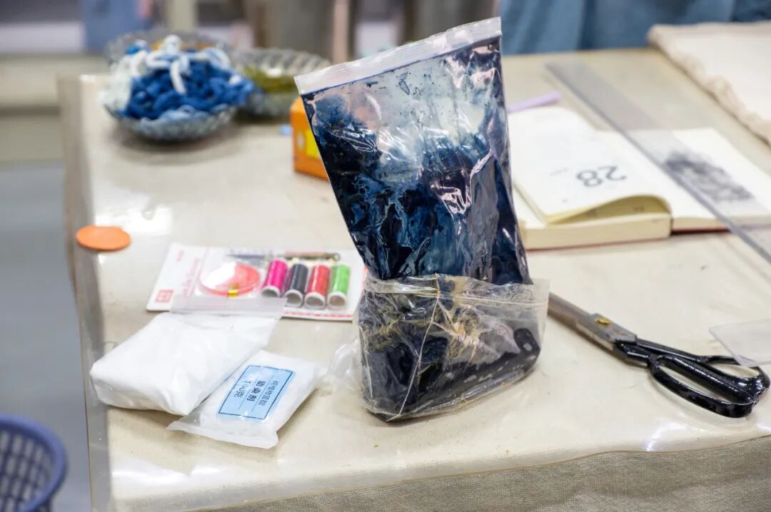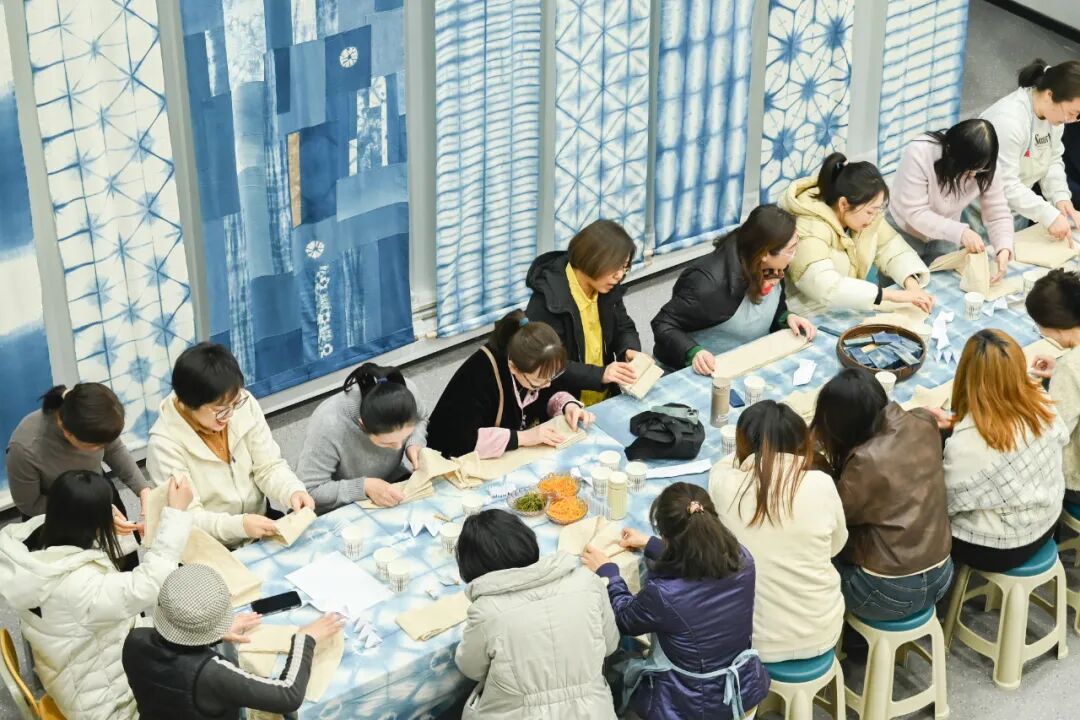 问:我很好奇,精准地选色和制版,在现代工业是一件很轻松的事情,轻轻移动鼠标即可获得,为什么传统草木染工艺仍然悦纳这种不确定?答:现代社会,工作和生活的节奏越来越快,确定性的确更有效率,能标准化生产。但是,传统草木染的不确定性,不仅仅是追求一份与众不同,使世界更加多元,它也让我们在身体力行的劳作中,重新感知到了生活本来的模样,默默体悟繁复工艺中蕴含的温情,学会在尽力而为后顺其自然。同时,这也是延续中华民族传统文化的一种方式。问:您觉得,在现代,我们去亲身感知和探索这种传统手工艺,是在感知它的制作技艺呢,还是它里面蕴含的一种文化和精神?答:我觉得这是传统技艺的传承,更是文化基因的印刻。比如,我们在初春时节,隐约看到草木反青的画面,脑子里都会出现“草色遥看近却无”的诗句,这就是中华文明区别于其他文明的一种符号。传统手工艺也是这样,通过身临其境地感知,不光是对精湛技艺的自信和认同,更是找到了中华民族共通的基因片段,它会不断地注入到我们的血脉中,一代一代地流淌下去。100多年前,从一朵棉花开始,纺纱织布,染色制衣,或许是大多数女性的辛苦日常。100多年后,当我们围坐在桌前,从一块白坯布开始,剪裁脱浆,绑扎染色,在传统工艺中觅到的是别样的美感和愉悦。这的确是一个非常了不起的跨越。在这100多年的时间里,有生产力的发展,有科技的革新,还有女性解放运动,令每一位女性能够机会均等地参与到社会当中,不仅在经济上实现了独立,并且有了自己选择的权利。这也正是学校在国际劳动妇女节之际,组织此项传统染织工艺体验的独特意义。