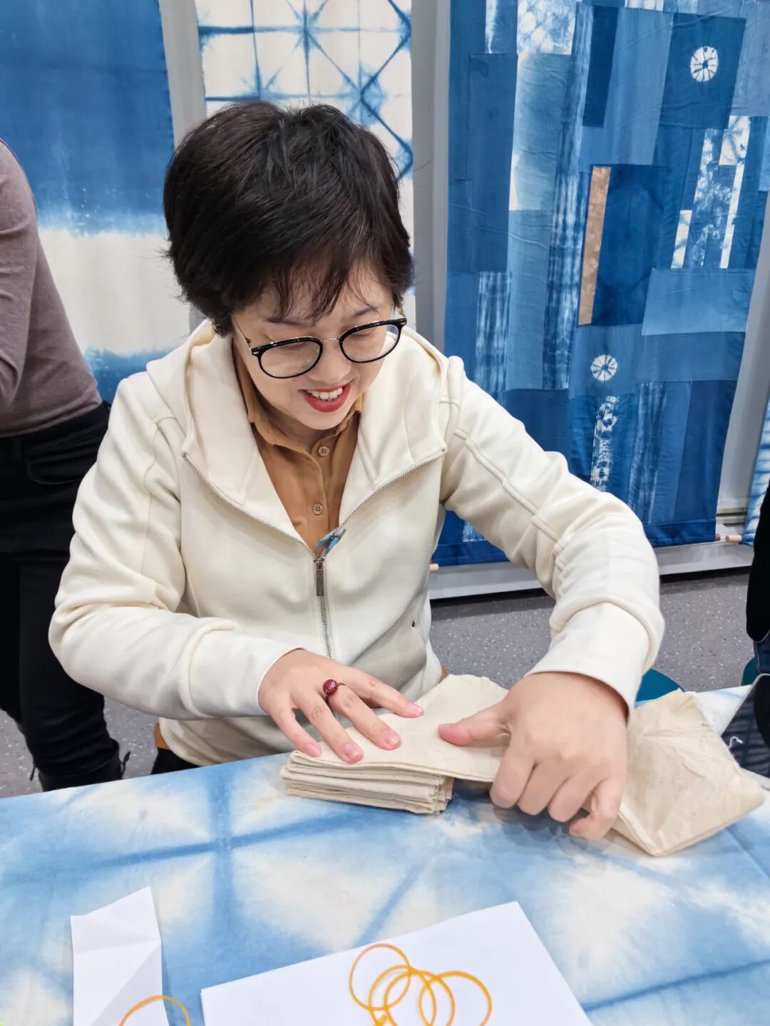 板蓝扎染会用到两项传统工艺——扎结和染色。