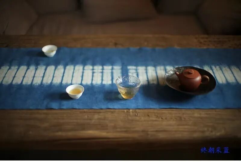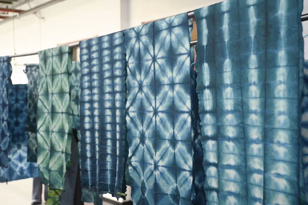快看晾晒架,有趣的一幕出现了:刚刚漂洗完毕的布块是黄绿色的,随后逐渐变蓝,经过5分钟的空气氧化,又回归成了沉静的靛蓝。《荀子•劝学篇》谓“青,取之于蓝,而胜于蓝”,就是古代文士目睹“蓝草”不可思议的蓝色素转化过程,以及经由蓝染缸染出更为出色的青碧色彩而发出的喟叹。